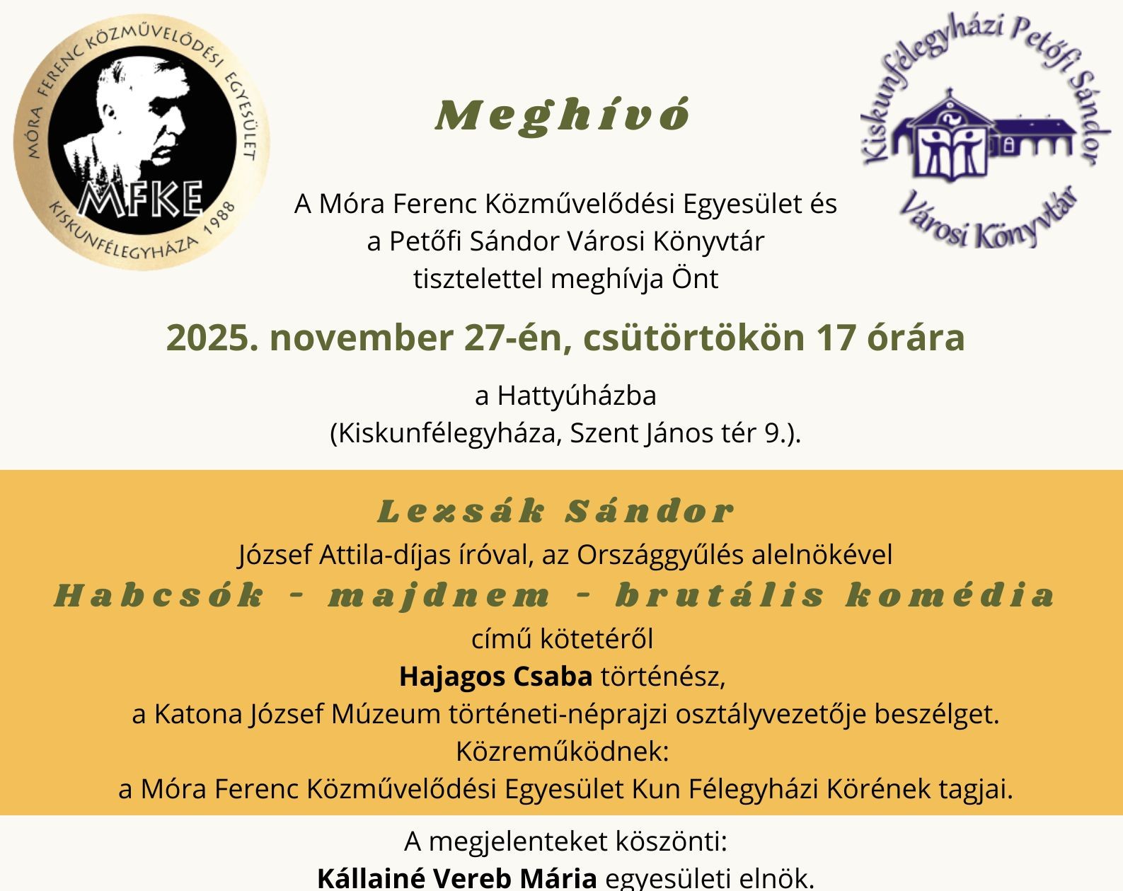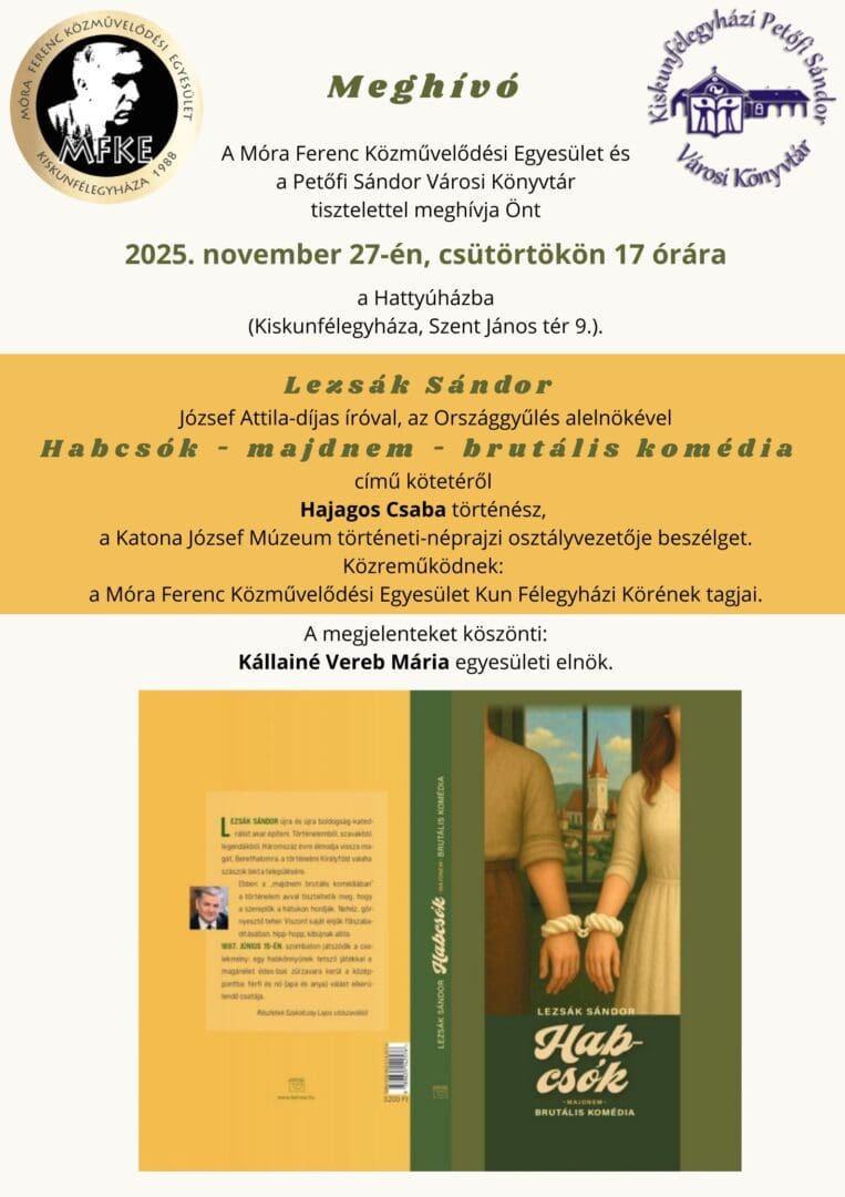 Bemutatják Lezsák Sándor Attila-díjas alkotó legújabb könyvét, a Habcsók – majdnem – brutális komédia címmel november 27-én, 17 órai kezdettel a Kiskunfélegyházi Petőfi Sándor Városi Könyvtárban.
