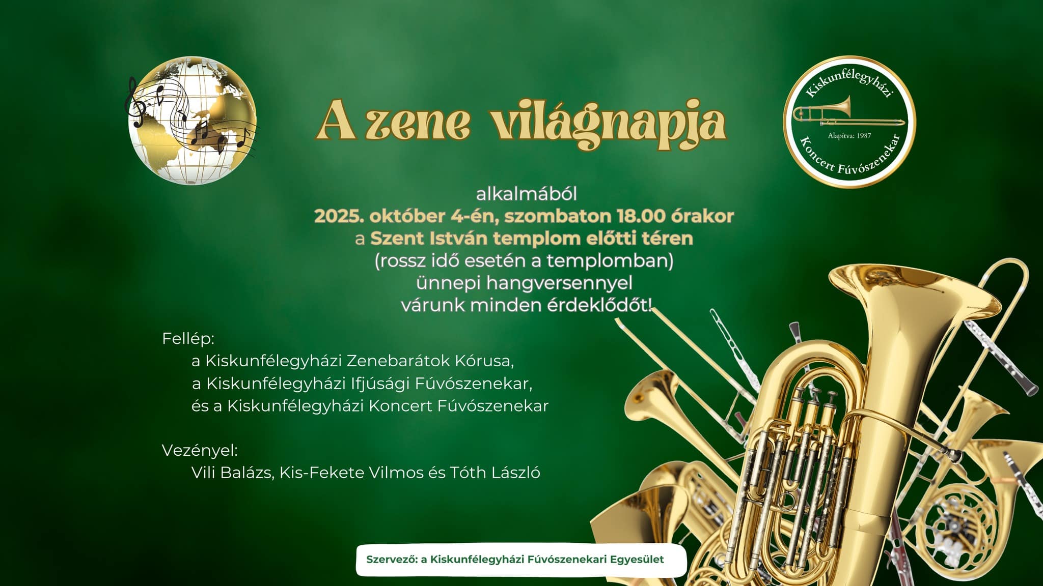 Ünnepi hangversenyre várják a zenekedvelőket október 4-én, szombaton 18 órától a Szent István Templom előtti téren, rossz idő esetén a templomban. A zene világnapja alkalmából különleges dallamok csendülnek fel a Kiskunfélegyházi Ifjúsági Fúvószenekar, a Kiskunfélegyházi Zenebarátok Kórusa és a Kiskunfélegyházi Koncert Fúvószenekar előadásában.