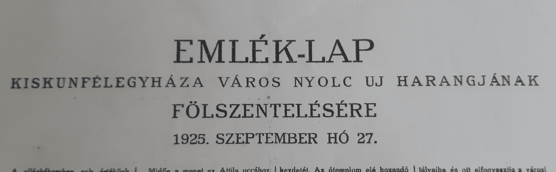 E szavakkal indította útjára a város vezetése a külön, szórólapokon megjelentetett: „EMLÉK-LAP Kiskunfélegyháza város nyolc uj harangjának FÖLSZENTELÉSÉRE 1925. szeptember hó 27.” című kiadványt, mely négy oldalon keresztül ad részletekbe menő tájékoztatást az eseményekről.