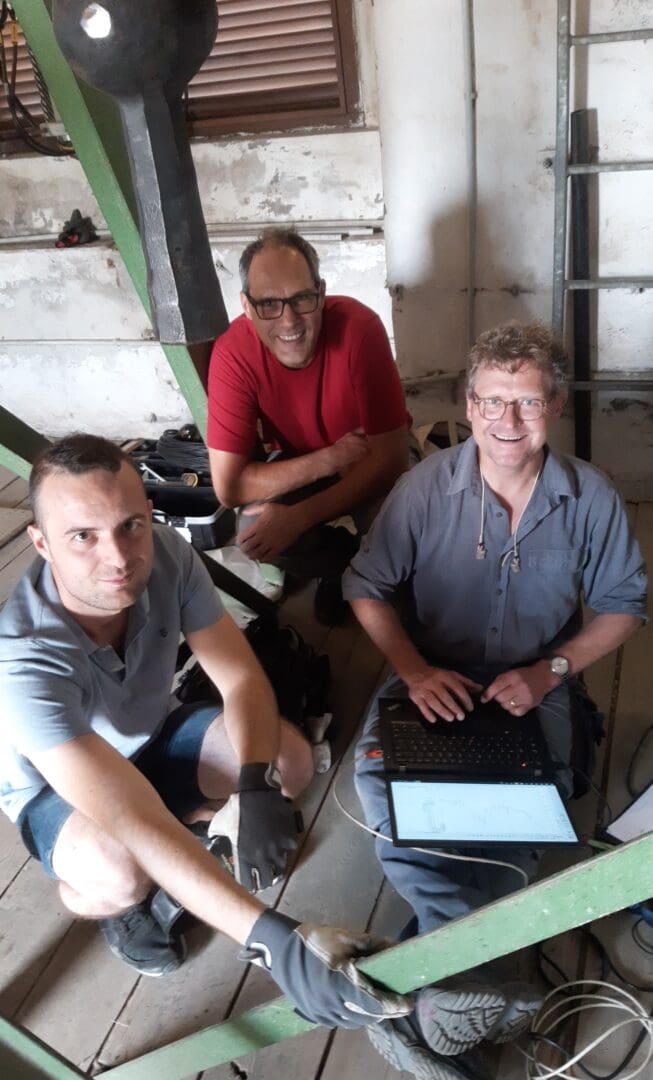 Michael Plitzner (jobbról), a harangtudományok doktora által vezetett speciális méréssorozat azonban egyértelművé tette, hogy a torony, mint építmény továbbra is stabil. Viszont a harangszék bólintó mozgása erősödött fel, ahogy – az igénybevétel és a rozsda miatt is – fárad az anyaga. Ez oda vezetett, hogy a 420 kilós harangot azonnal le kellett kötni a rendszerről, mert az ő lengése 1,8 százalék távolságra van a toronyéhoz. A bevett gyakorlat szerint ez a távolság 10 százalékon túl kell legyen! A többi harang „üzemidejét” pedig drasztikusan csökkenteni kényszerültünk.