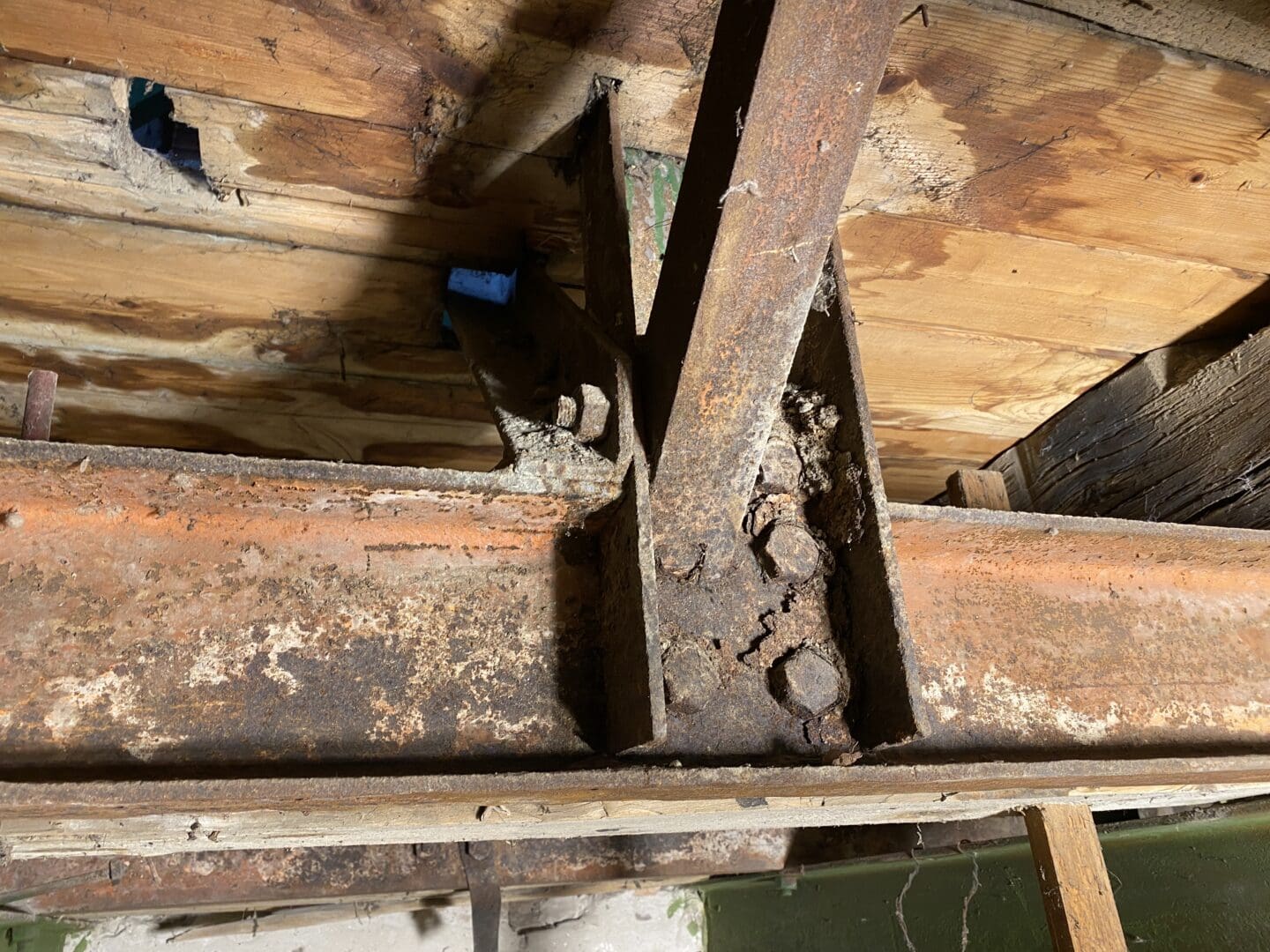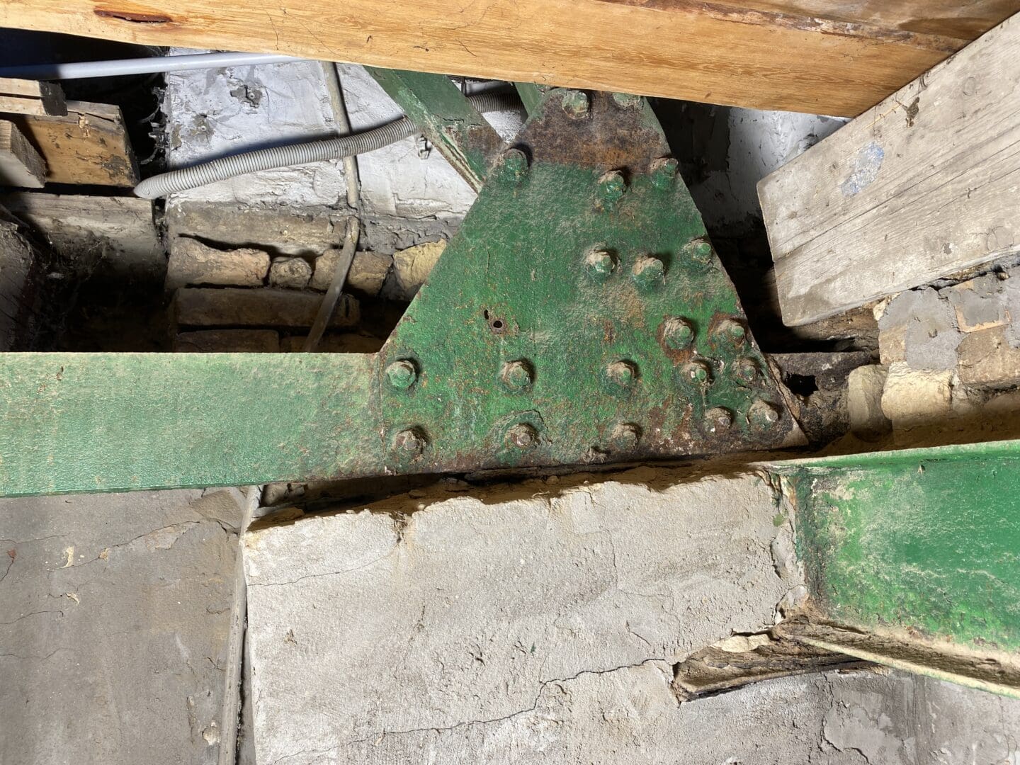A fenti két fotó a harangszék lábainak jelenlegi állapotát mutatja. Éppenhogy össze nem roskadnak...