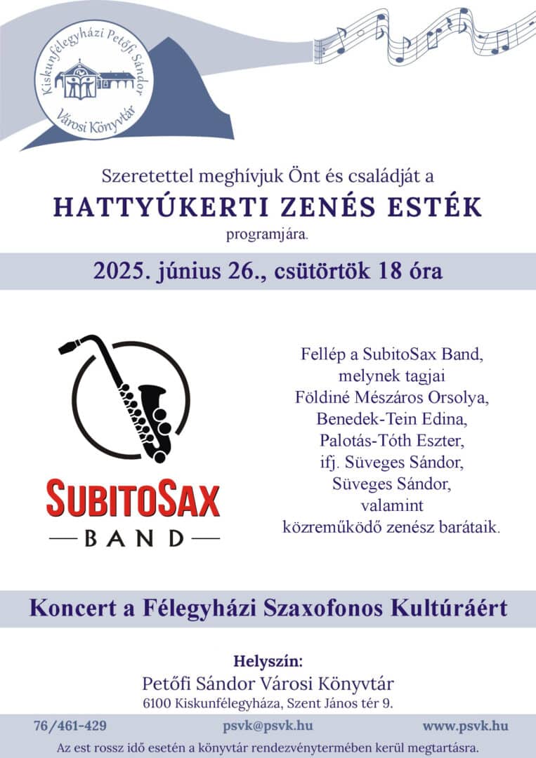 A zene ismét benépesíti a Hattyúkertet: június 26-án 18 órától újabb koncerttel folytatódik a Hattyúkerti zenés esték programsorozat a Kiskunfélegyházi Petőfi Sándor Városi Könyvtárban. Az est címe, Koncert a Félegyházi Szaxofonos Kultúráért, ami már önmagában is sejteti, hogy ezúttal a szaxofoné lesz a főszerep.