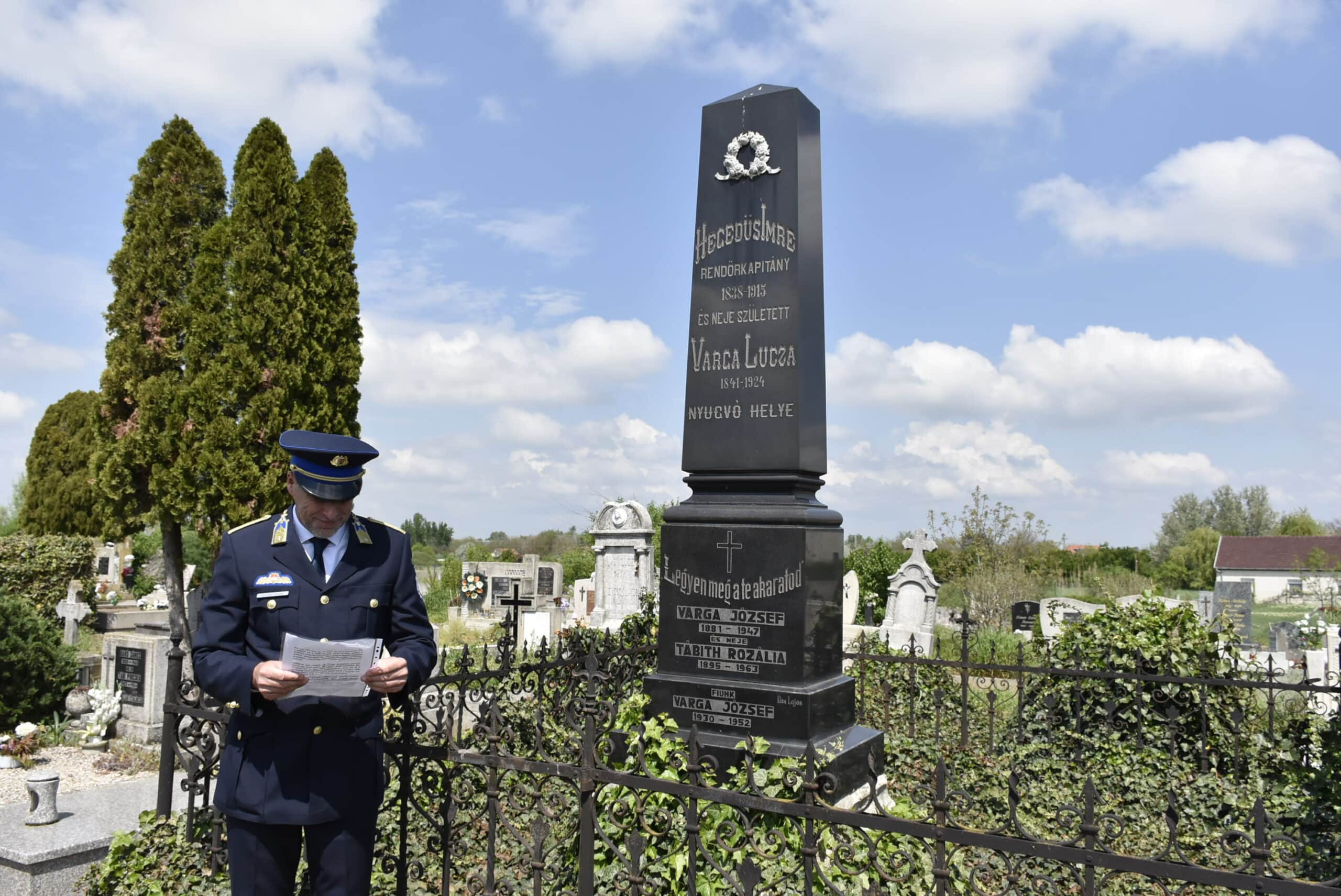 – Mindannyiunk életében vannak olyan napok, amikor megállunk egy pillanatra, elcsendesedünk, és számot vetünk az elmúlt időszak sikereiről, nehézségeiről, veszteségeiről. A rendőrség életében ez a nap április 24., Szent György napja, a rendőrség hivatalos ünnepe. E jeles alkalomhoz kapcsolódva emlékezünk meg a város egykori rendőrkapitányáról, Hegedűs Imréről, aki 1883 és 1889 között töltötte be ezt a tisztséget Kiskunfélegyházán.