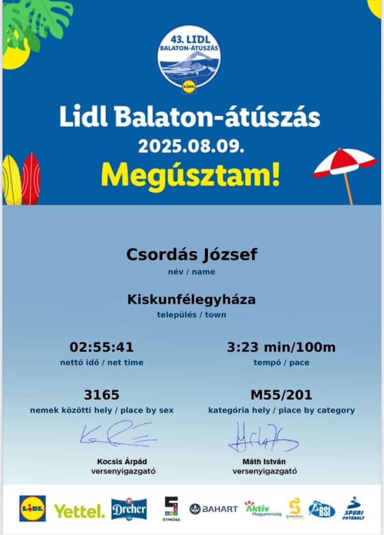 – Nagyon szeretem a Balatont. Családommal minden évben meglátogatjuk a tavat, sokkal szívesebben utazunk oda, mint külföldre. Nyilván a nyaralás ma már a versenyhez igazítva történik, de ehhez már hozzászoktak. Az egész család, sőt a munkahelyemen is támogatnak és szurkolnak nekem. Nagy öröm számomra, hogy Máté fiam terve szerint jövőre ő is rajthoz áll velem – árulta el Csordás József.