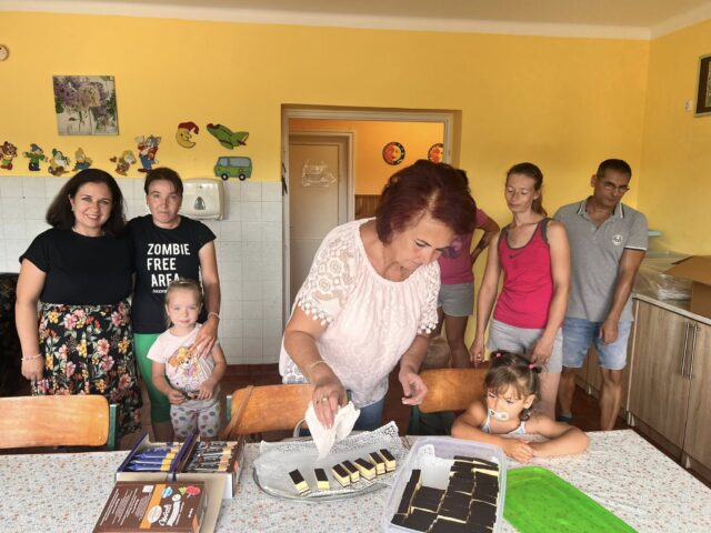 Az iskolaszerek mellett egy kis édességgel is kedveskedtek a gyermekeknek, házi sütemény és müzliszelet is szerepelt ajándékként, a csomagok mellett.