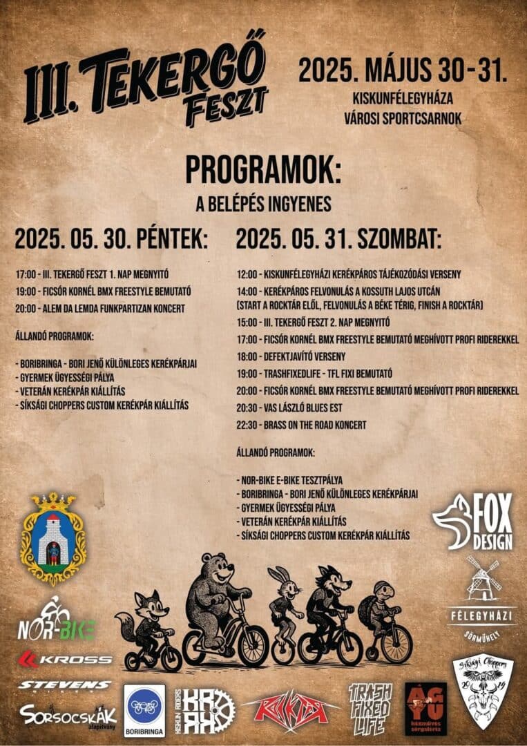 – Szombaton délelőtt 11-kor indul egy ingyenes kerékpáros tájékozódási verseny, játékos feladatokkal és nyereményekkel. Délután 13 órától jön a színes kerékpáros felvonulás, majd 14 órától ismét folytatódik a fesztivál. BMX-bemutató is lesz profi Riderekkel, defektjavító verseny, fixi freestyle show, majd este Vas László blues estje, végül a Brass On The Road koncertje zárja a napot.