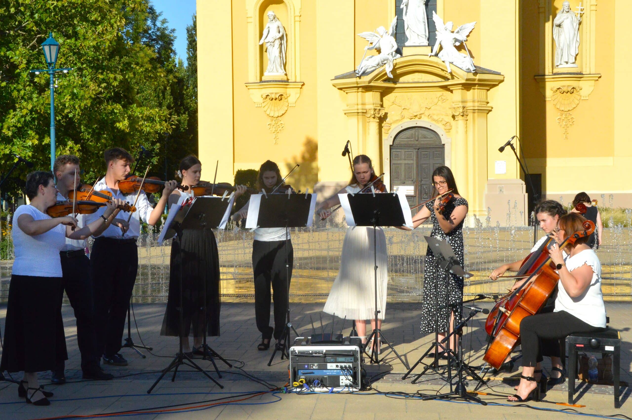 Folytatódott a Béke-Tér-Zene programsorozat augusztus 8-án, pénteken este a Sarlós Boldogasszony Templom előtt. Az eseményen a Kiskunfélegyházi Balázs Árpád Alapfokú Művészeti Iskola vonósegyüttese lépett fel Závogyánné Varga Ildikó és Kurai-Kis Szilvia vezetésével.