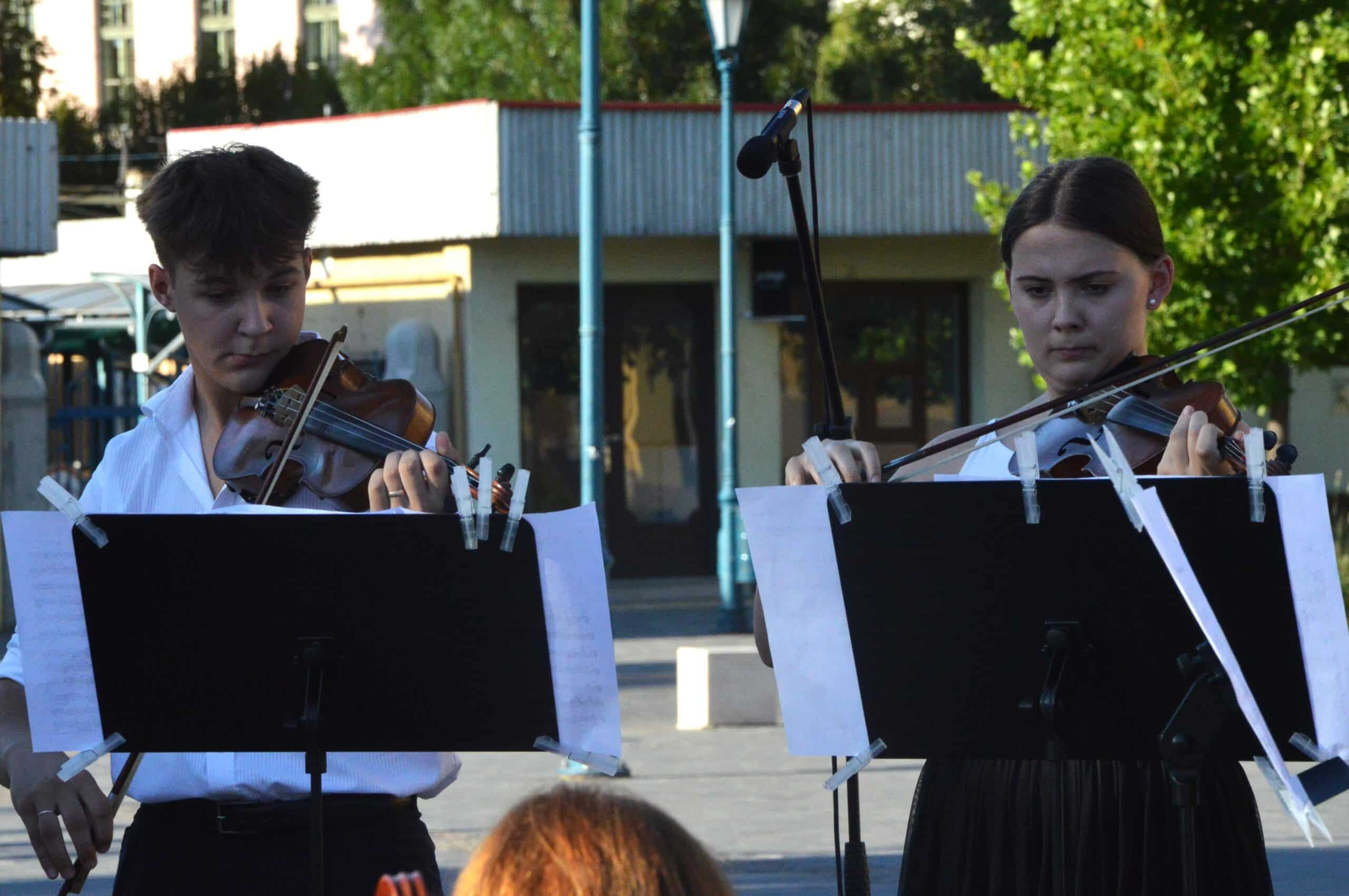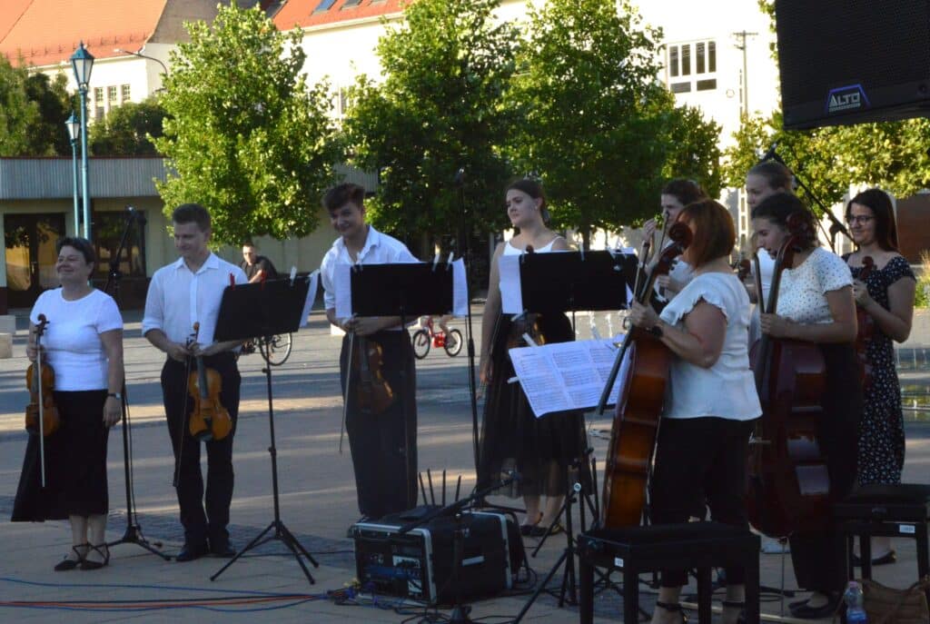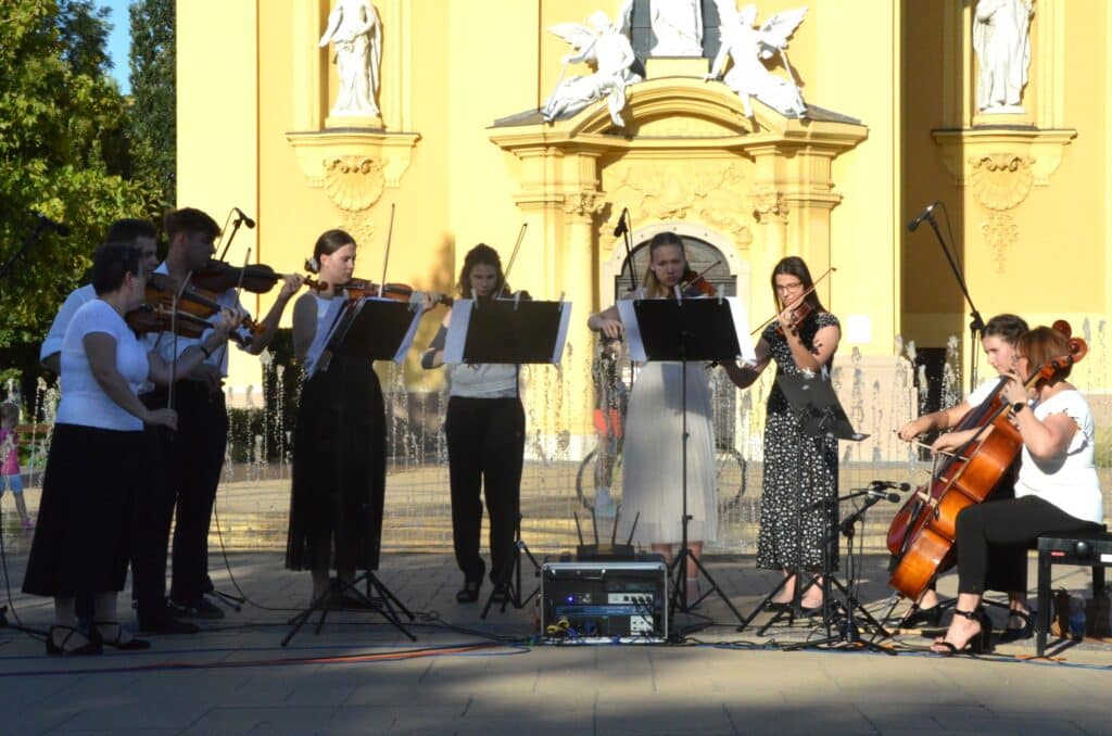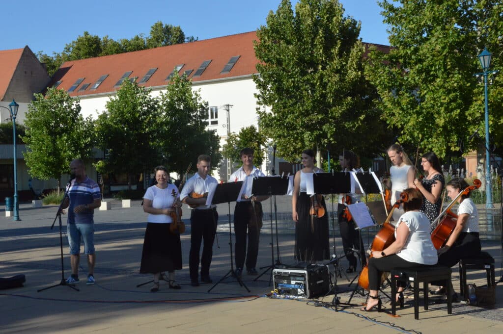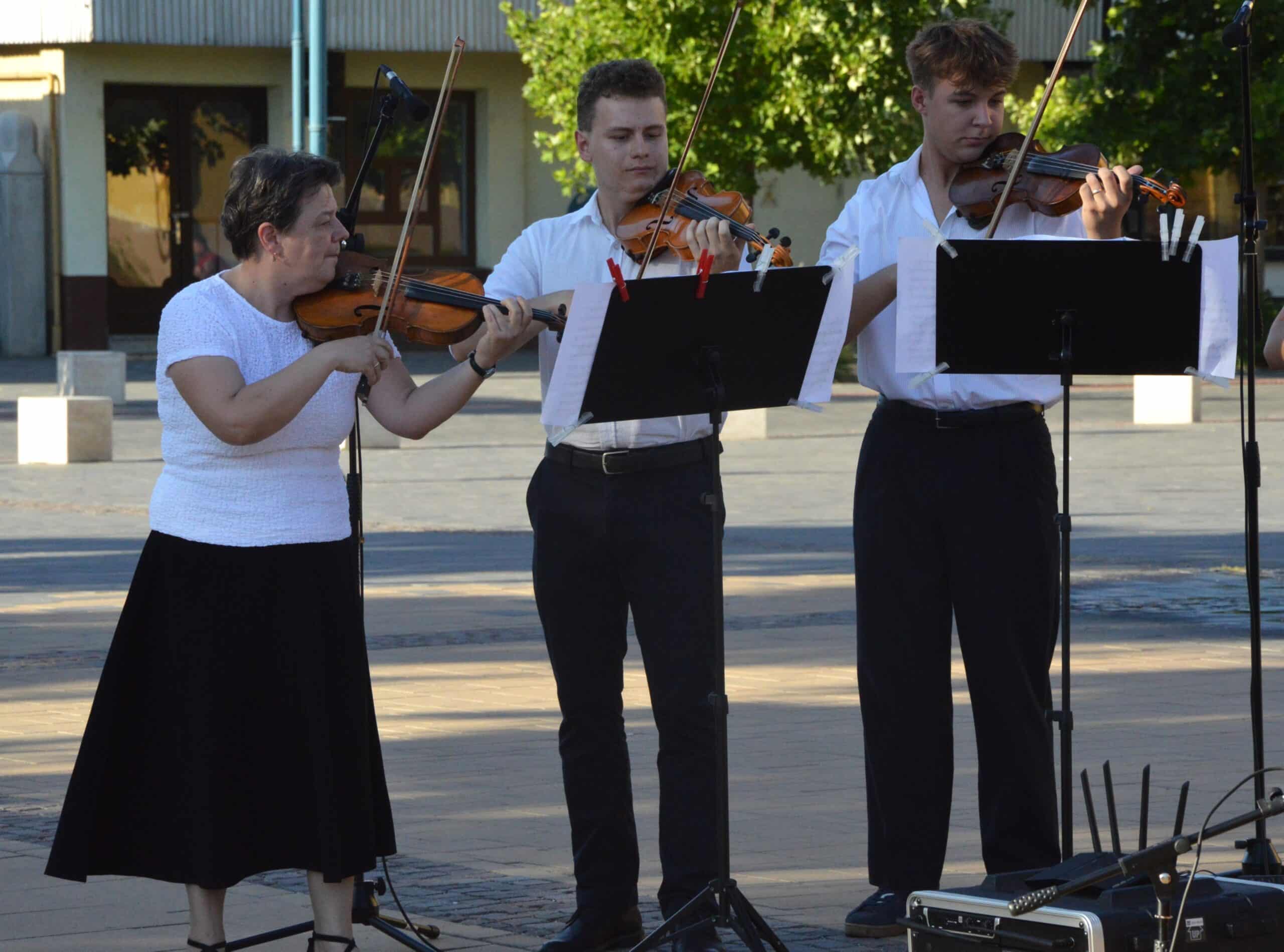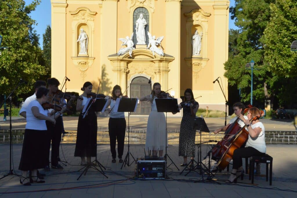 Folytatódott a Béke-Tér-Zene programsorozat augusztus 8-án, pénteken este a Sarlós Boldogasszony Templom előtt. Az eseményen a Kiskunfélegyházi Balázs Árpád Alapfokú Művészeti Iskola vonósegyüttese lépett fel Závogyánné Varga Ildikó és Kurai-Kis Szilvia vezetésével.