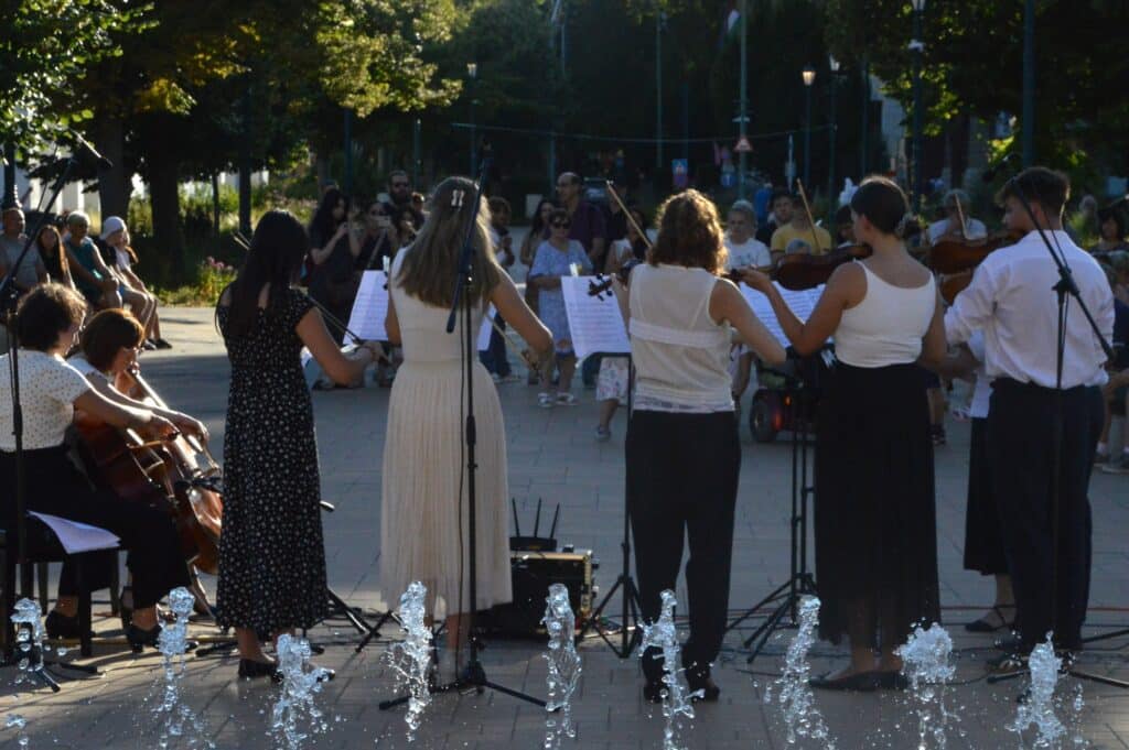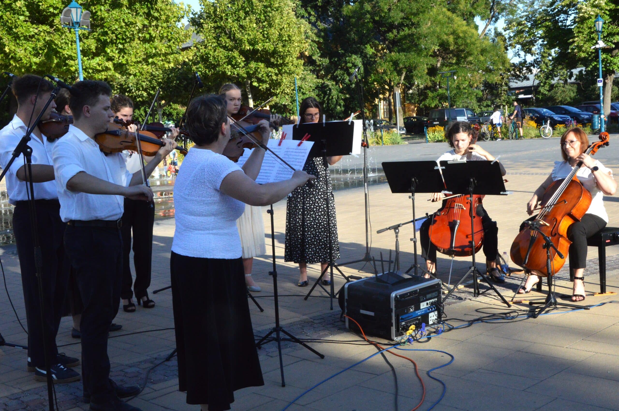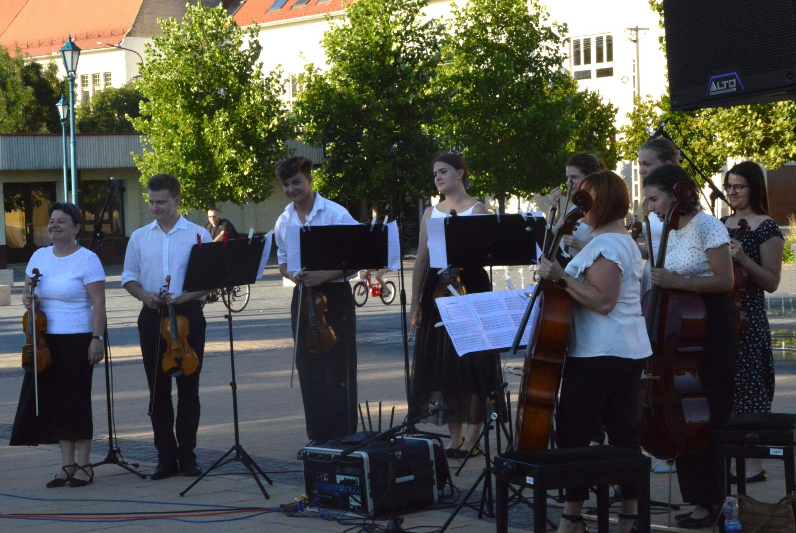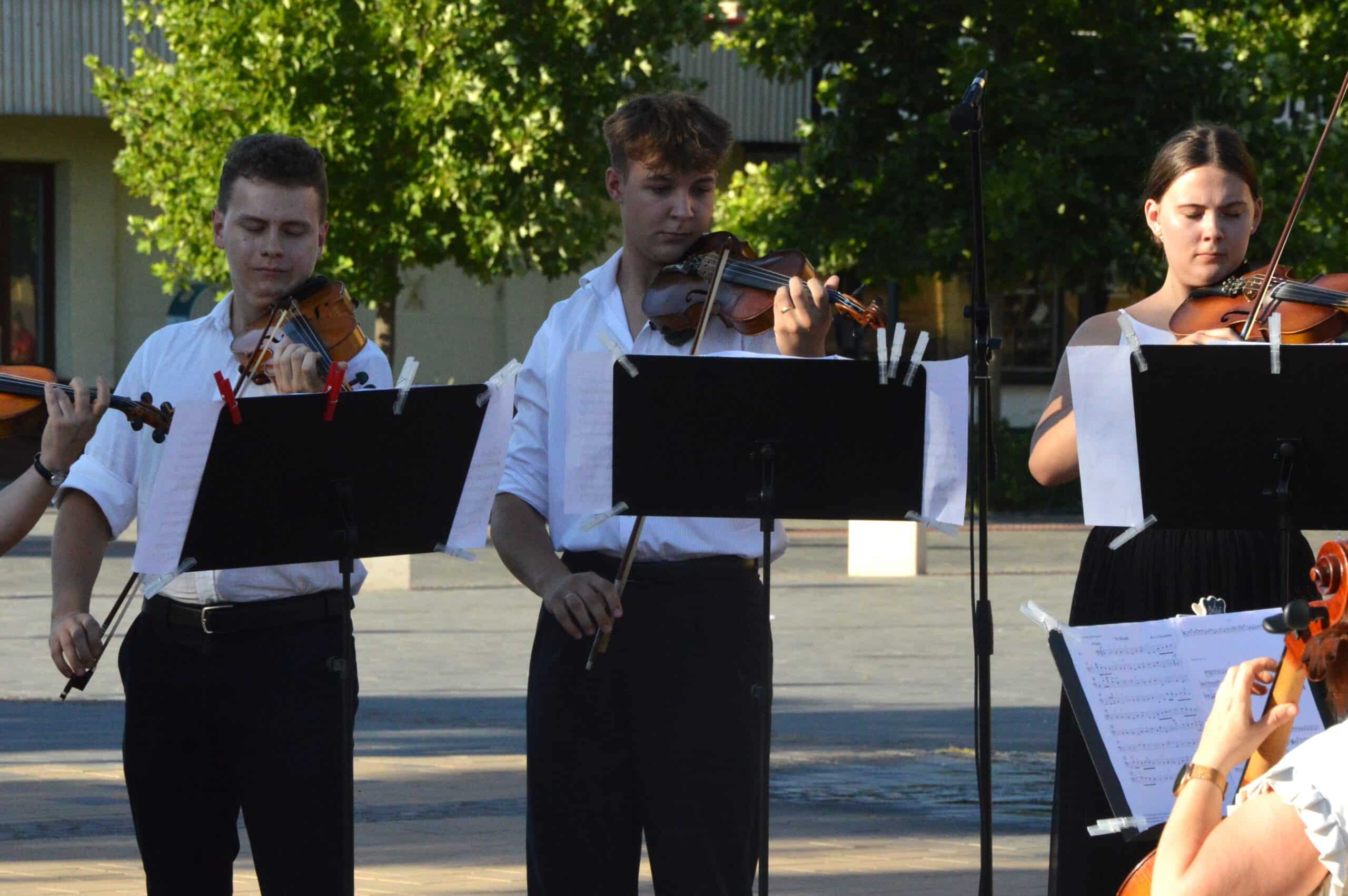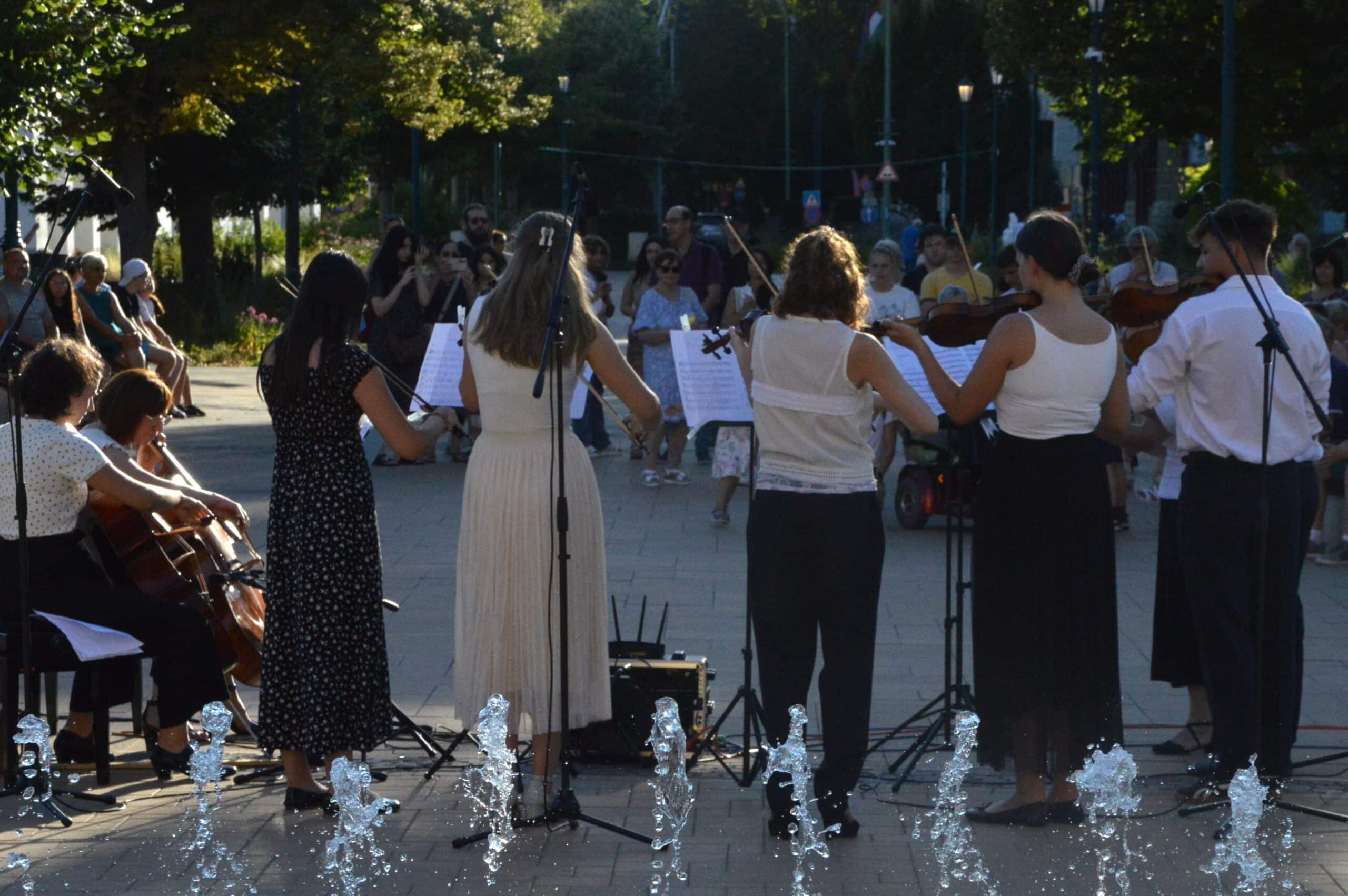 A megjelenteket Kis-Fekete Vilmos igazgató köszöntötte, aki bemutatta és büszkén konferálta fel a zenekart. Az ebben a formációban mindössze egy éve zenélő együttes csodálatos, békés félórát teremtett a téren, barokk repertoárjukban Charpentier, Händel és a finn Jean Sibelius műveit szólaltatták meg páratlan összhangban. A közönség háláját vastapssal fejezte ki, amelynek eredményeképpen a záró dalt újra eljátszotta a vonósegyüttes.