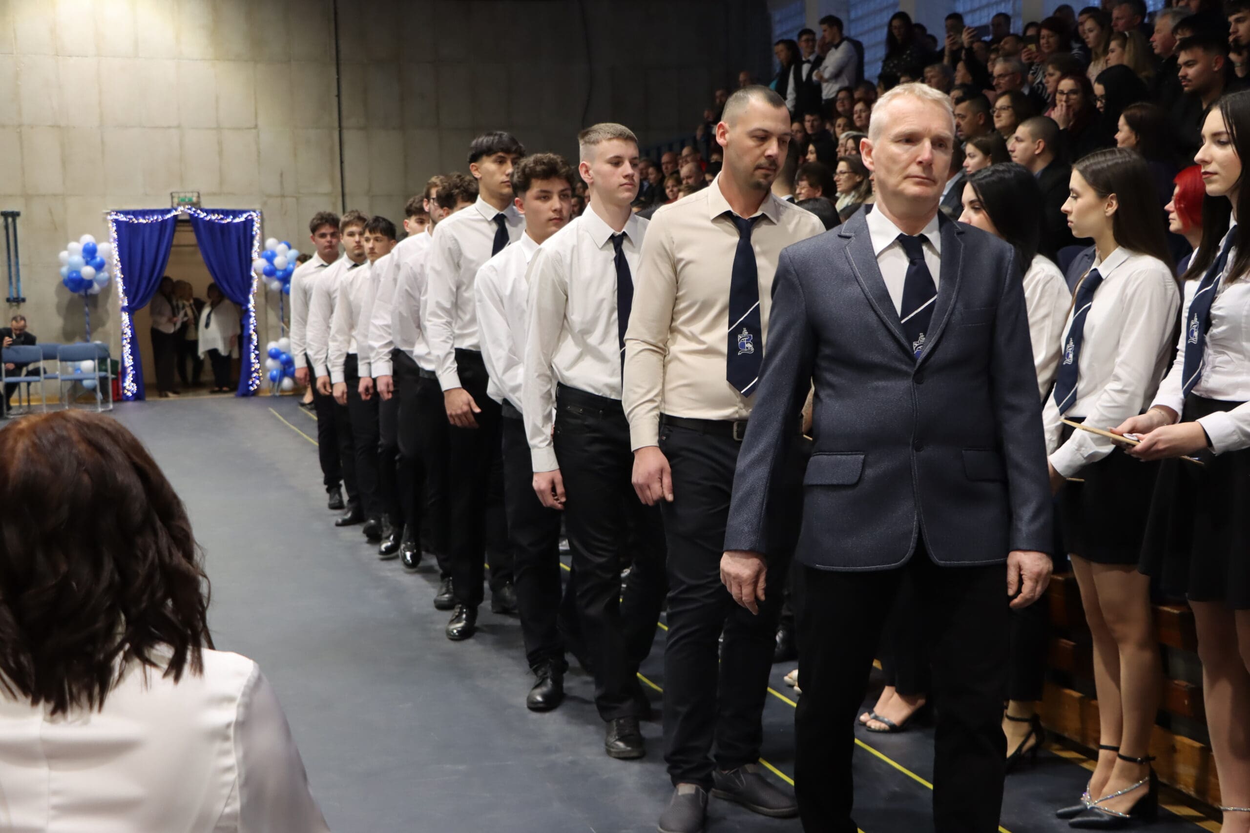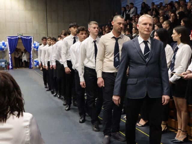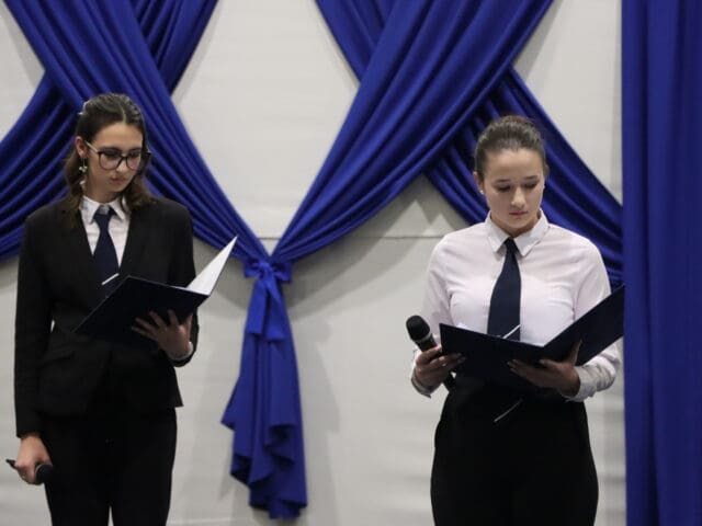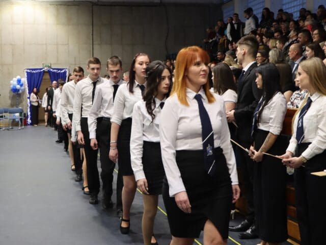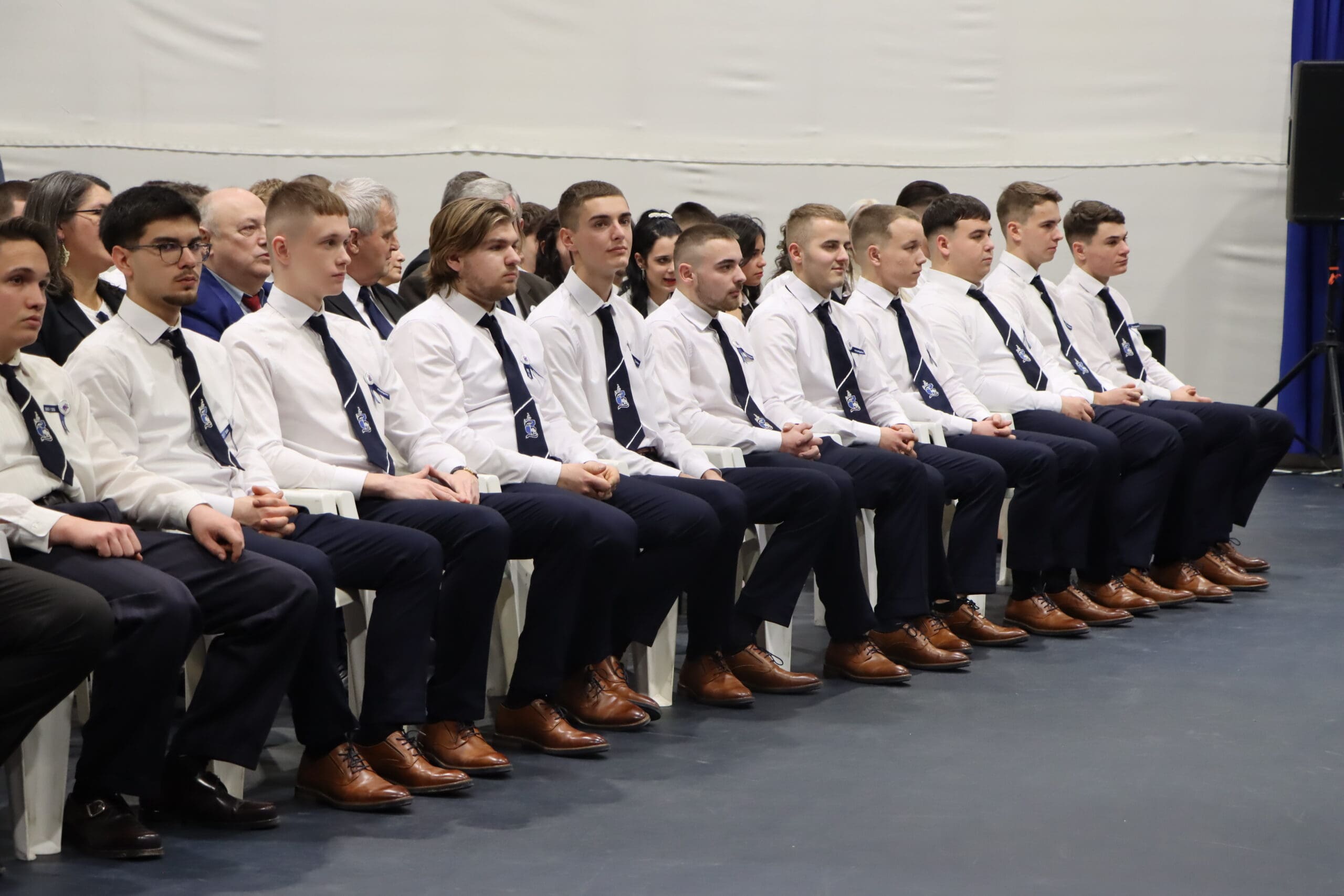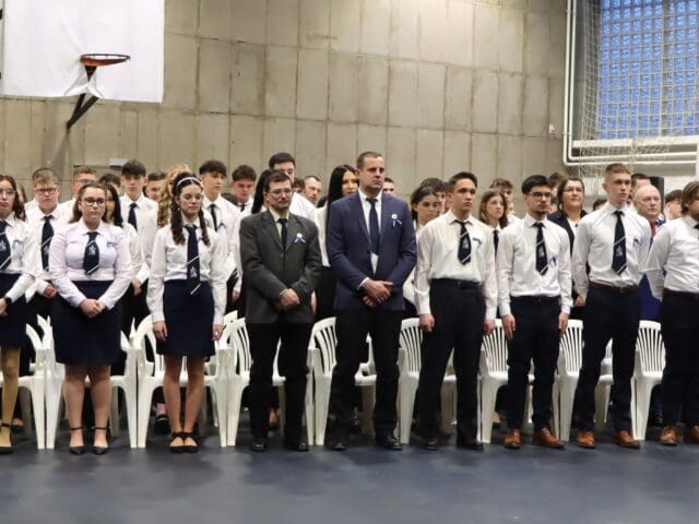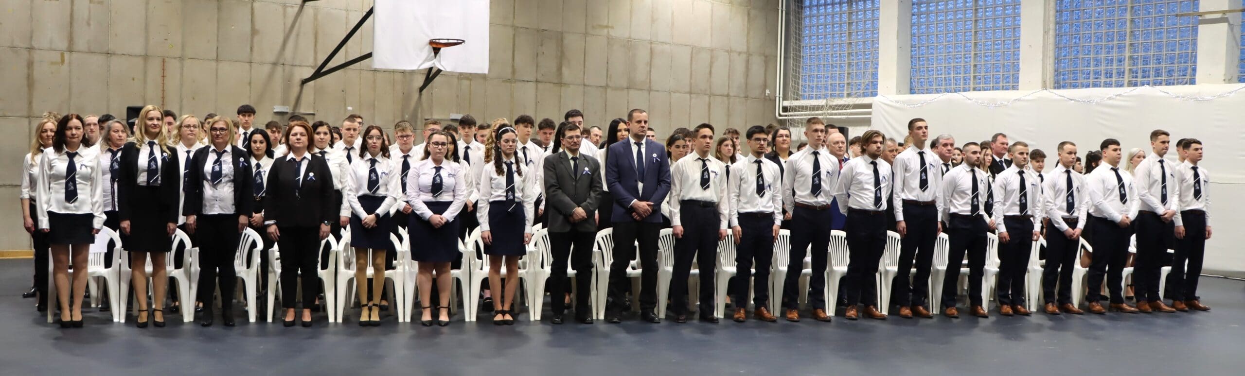 Az ünnepség elején a narrátorok köszöntötték a megjelent szülőket, pedagógusokat és meghívott vendégeket, köztük a szakképzési centrum vezetőit és az iskola jelenlegi és egykori igazgatóit. A szalagtűzés pillanatai – névsorolvasással, ünnepélyes bevonulással – csendes méltósággal jelezték: egy korszak lassan lezárul.