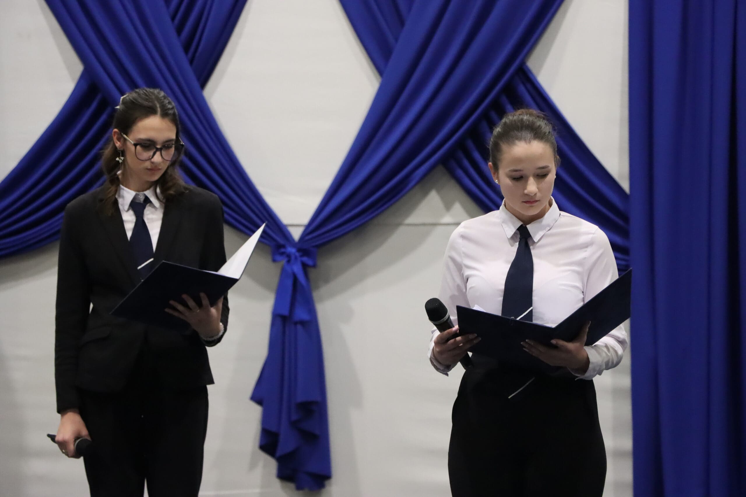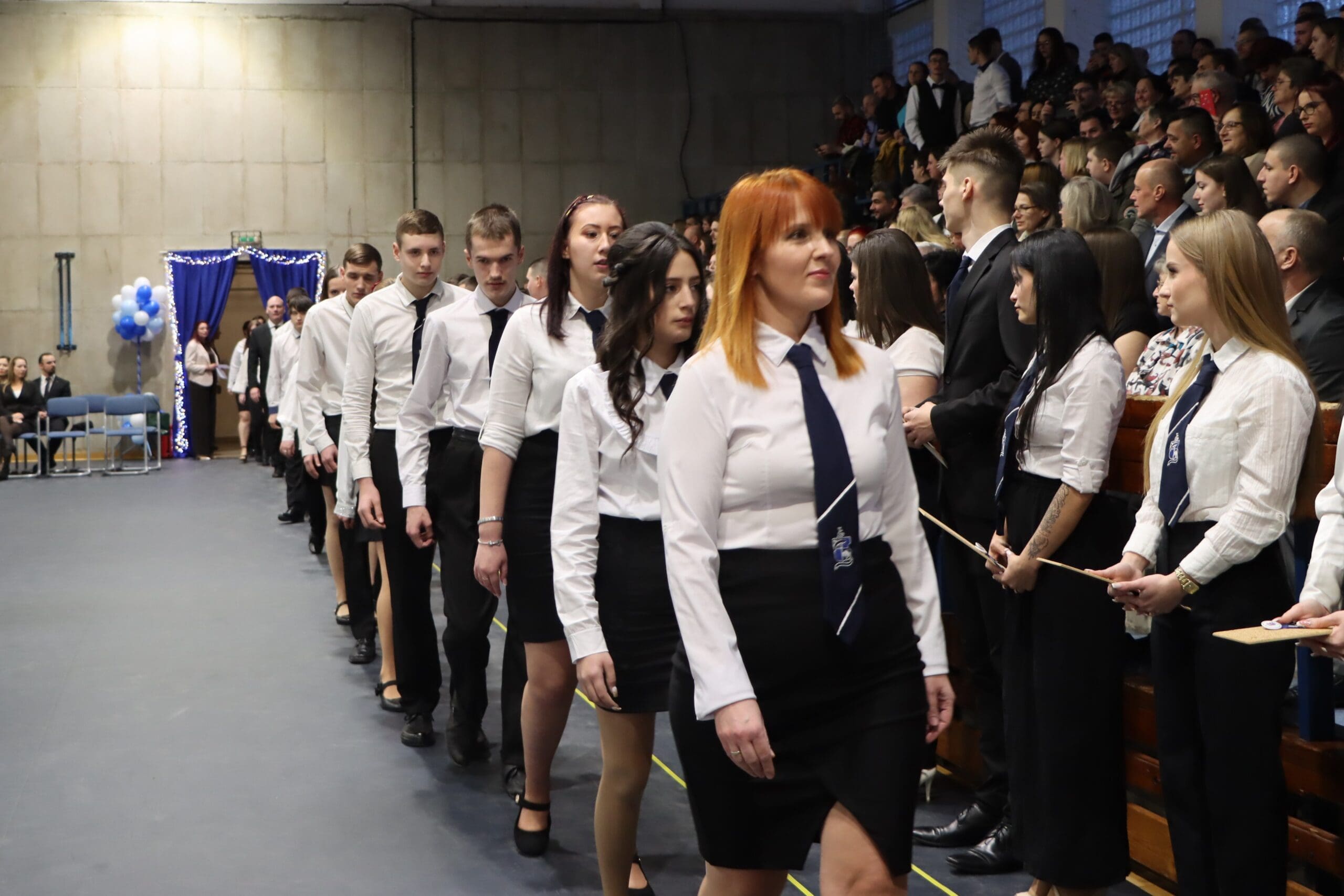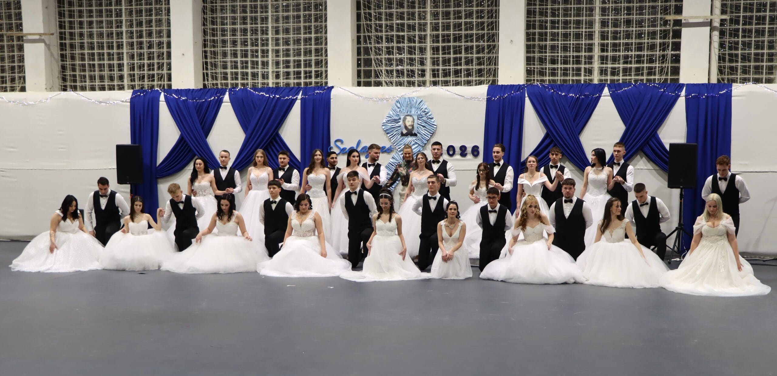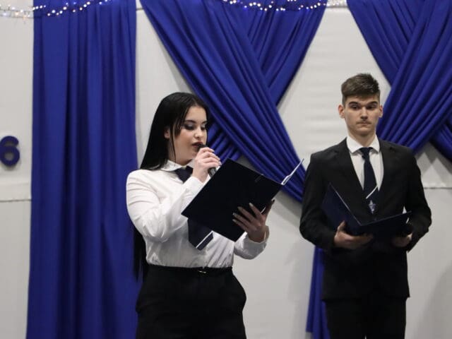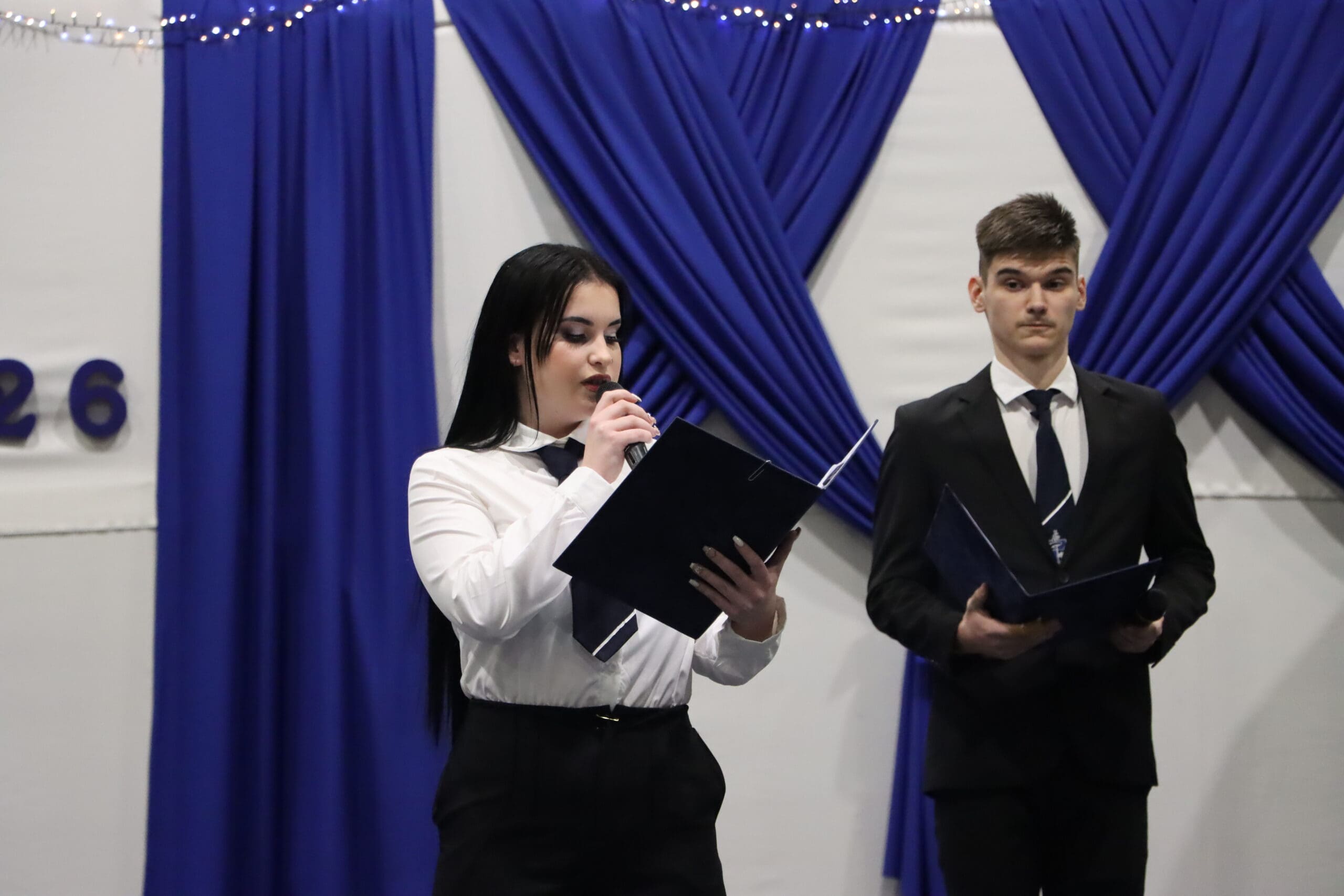 Az ünnepség elején a narrátorok köszöntötték a megjelent szülőket, pedagógusokat és meghívott vendégeket, köztük a szakképzési centrum vezetőit és az iskola jelenlegi és egykori igazgatóit. A szalagtűzés pillanatai – névsorolvasással, ünnepélyes bevonulással – csendes méltósággal jelezték: egy korszak lassan lezárul.