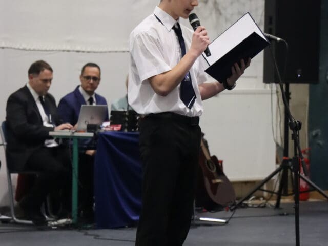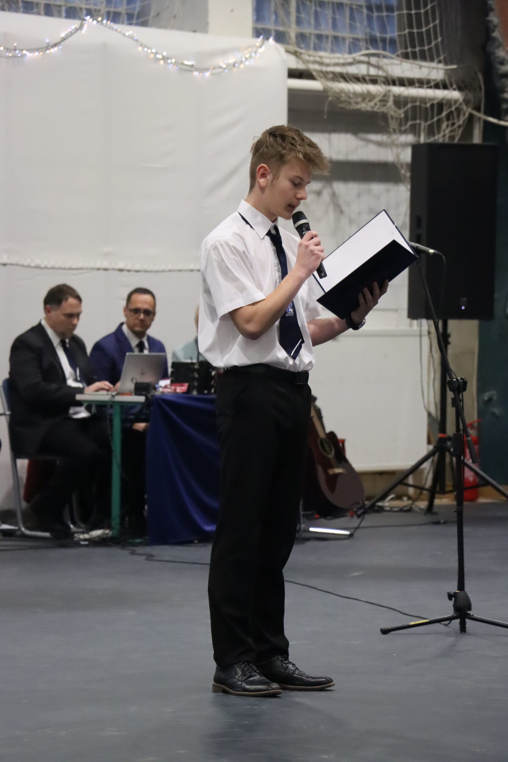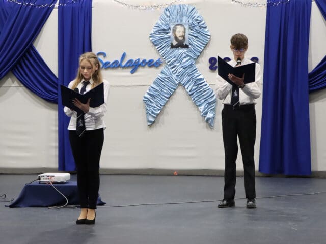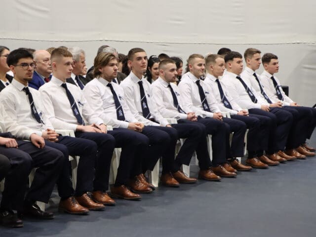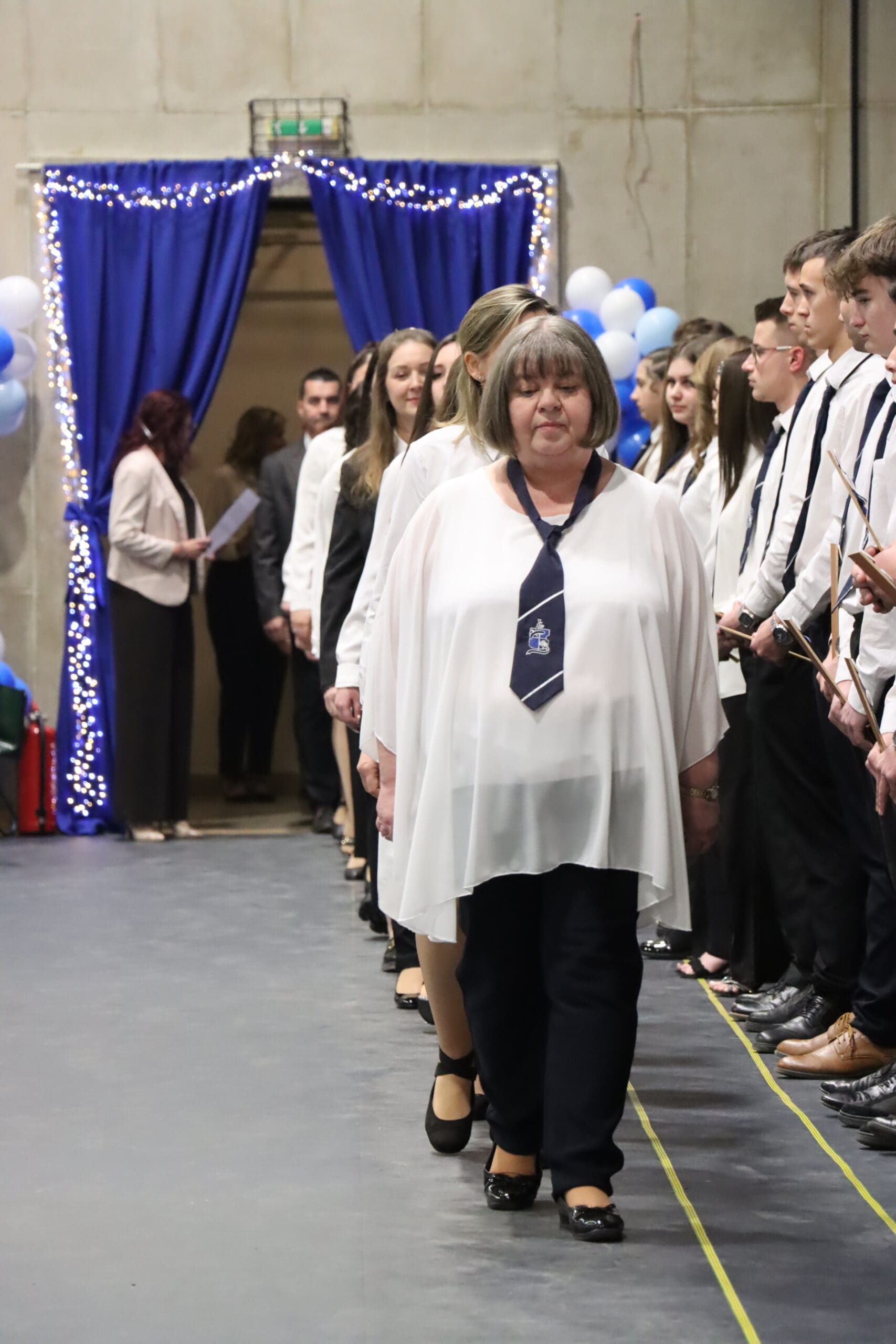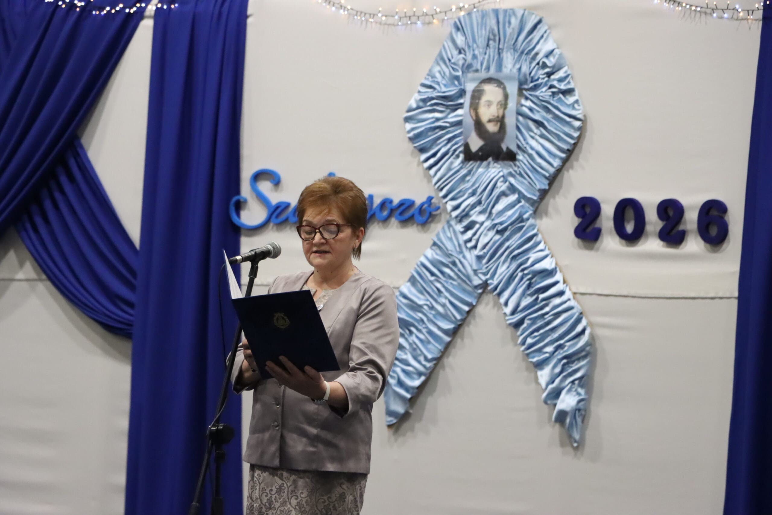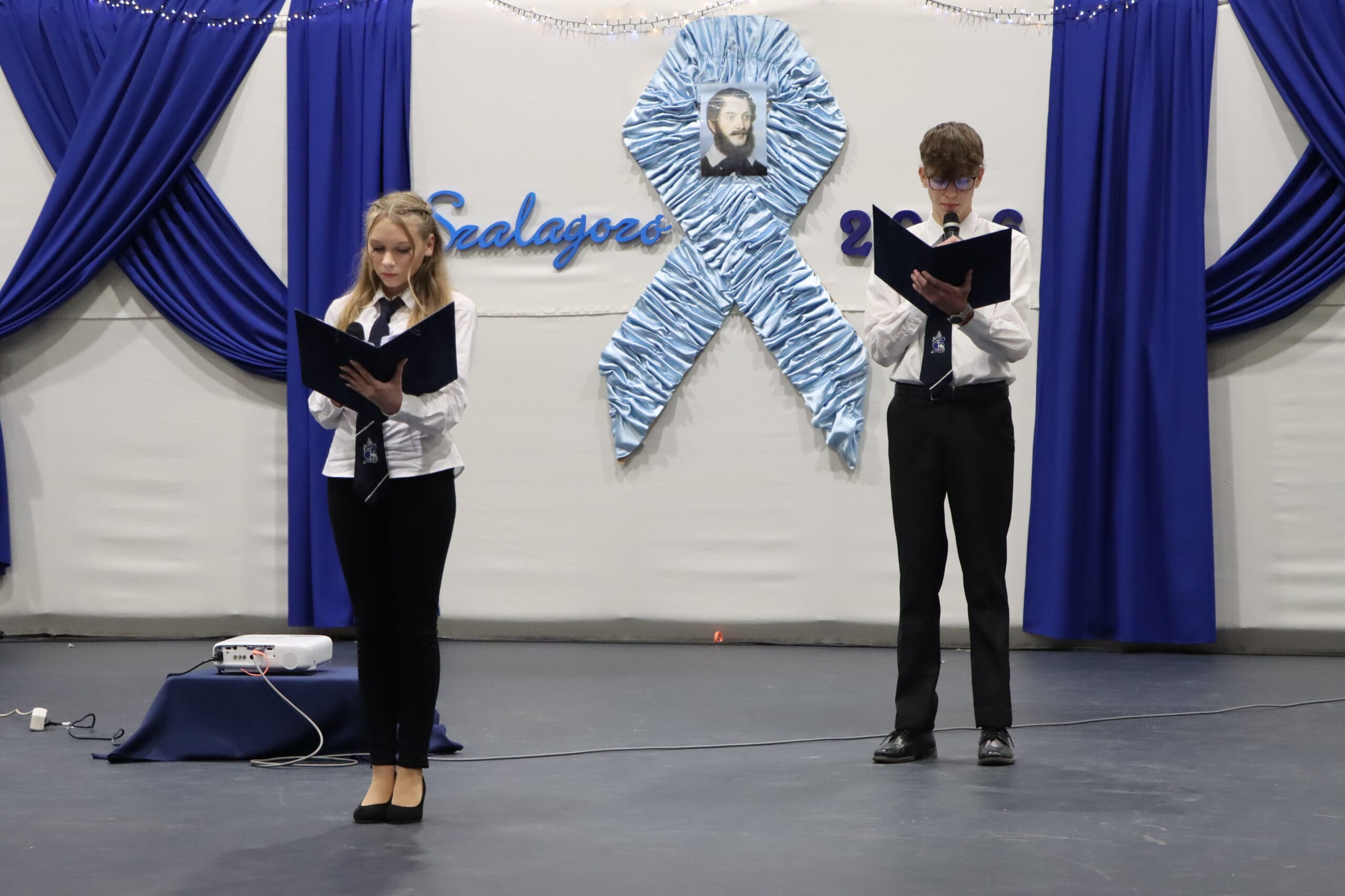 Az ünnepség elején a narrátorok köszöntötték a megjelent szülőket, pedagógusokat és meghívott vendégeket, köztük a szakképzési centrum vezetőit és az iskola jelenlegi és egykori igazgatóit. A szalagtűzés pillanatai – névsorolvasással, ünnepélyes bevonulással – csendes méltósággal jelezték: egy korszak lassan lezárul.