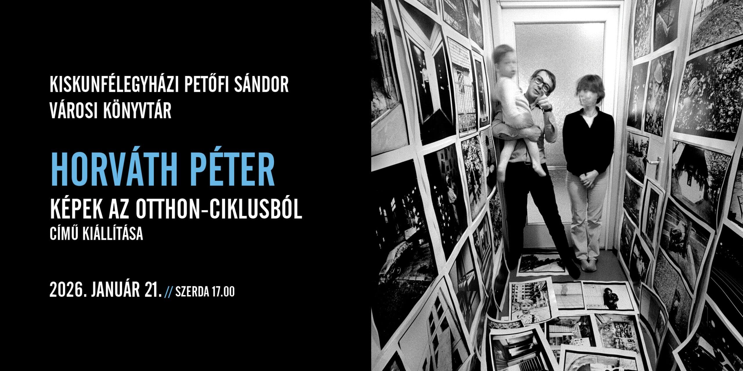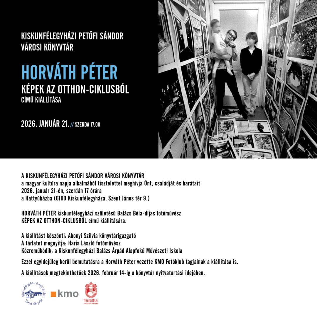 Horváth Péter félegyházi születésű, Balázs Béla-díjas fotóművész Képek az Otthon-ciklusból című tárlata január 21-én, 17 órakor nyílik meg a Kiskunfélegyházi Petőfi Sándor Városi Könyvtárban, a magyar kultúra napja alkalmából. A kiállításon az alkotó által vezetett KMO Fotóklub tagjainak bemutatkozó munkái is helyet kapnak.
