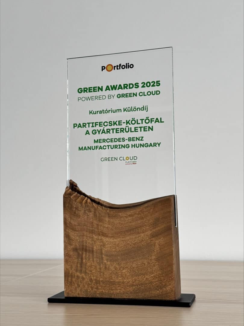 Mind a Portfolio.hu Green Awards, mind a Trade magazin Fenntarthatóság szimbóluma versenyén díjjal jutalmazták a kecskeméti Mercedes-Benz Gyár partifecske-költőfal kialakítását célzó környezetvédelmi kezdeményezését. A környezetvédelmi projekt célja, hogy egy biztonságos költőhely kialakításán keresztül támogassa a madarak fajfenntartását és segítse a populáció tanulmányozását. Az utóbbi években jelentősen megfogyatkozott a partifecske-állomány, a megmentésükre indult projekt sikeres megvalósítását pedig két díjjal is jutalmazták: elnyerte a Trade magazin versenyén a Fenntarthatóság szimbóluma elismerést CSR környezeti kategóriában, valamint kiérdemelte a Kuratórium Különdíját a Green Cloud és a Portfolio Csoport Green Awards 2025 versenyén.