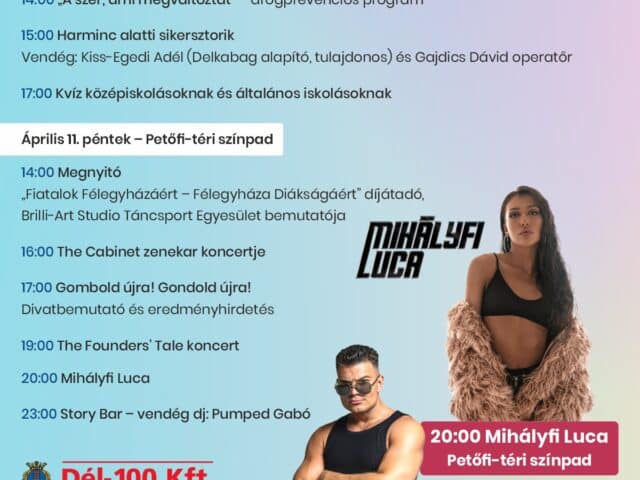 Április 11-én, pénteken, 14 órakor a Petőfi-téren felállított színpadon a Brilli-Art Studio Táncsport Egyesület bemutatójával kezdődnek az események. A Fiatalok Félegyházáért, Félegyháza Diákságáért elismerések átadásával folytatódik a program, ahol az év középiskolai pedagógusát és diákját díjazzák.
