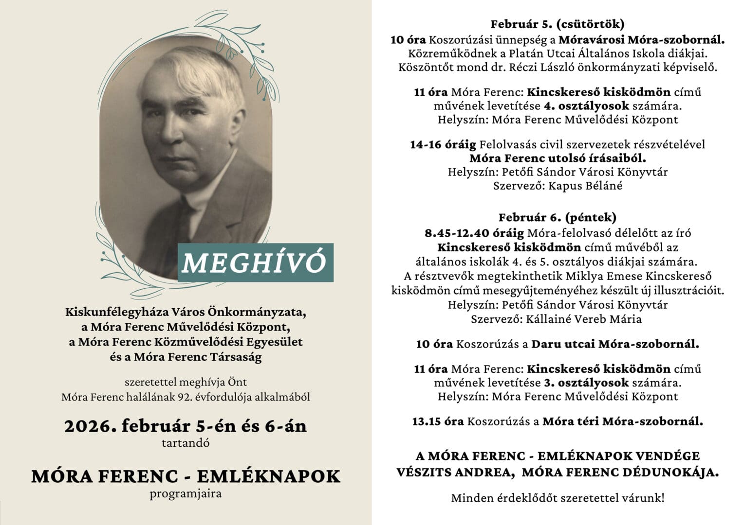 Az ünnepségsorozat február 5-én, csütörtökön koszorúzási ünnepséggel veszi kezdetét a Móravárosi Móra-szobornál, ahol a Kiskunfélegyházi Platán Utcai Általános Iskola diákjai is közreműködnek. A megemlékezésen köszöntőt mond dr. Réczi László önkormányzati képviselő. A délelőtt folyamán a fiatalabb korosztály is közelebb kerülhet Móra Ferenc világához, ugyanis megtekinthetik a Kincskereső kisködmön című filmet a Móra Ferenc Művelődési Központban.