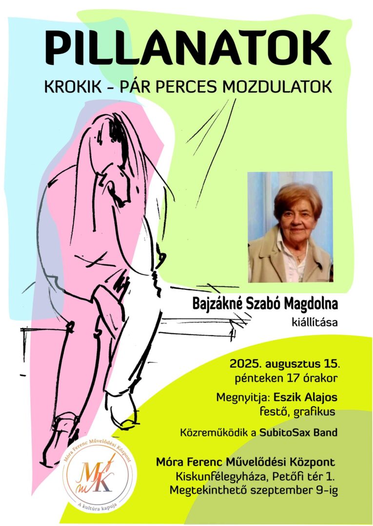 Különleges képzőművészeti élményre invitálják az érdeklődőket augusztus 15-én, pénteken 17 órakor, a Móra Ferenc Művelődési Központ kiállítóterébe, ahol megnyílik Bajzákné Szabó Magdolna "Pillanatok – Krokik – Pár perces mozdulatok" című tárlata.