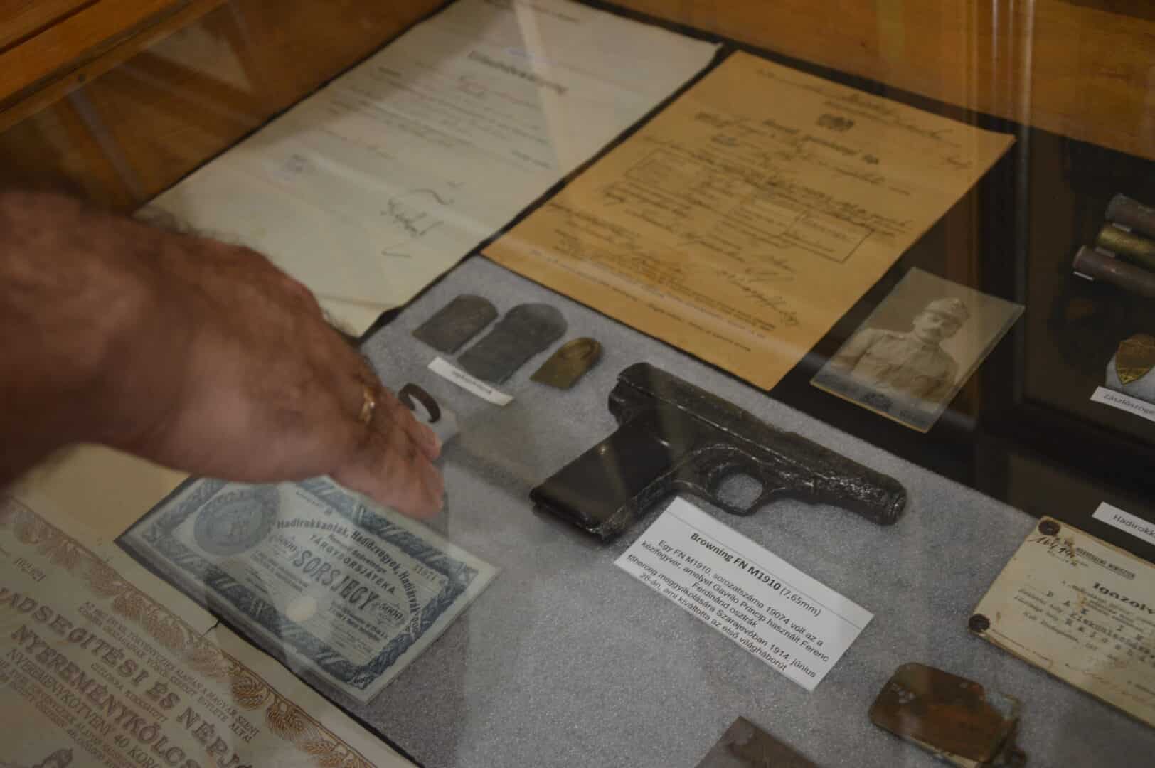 – Az a kicsi fekete pisztoly, ami a frontot is megjárta, ugyanolyan típus, mint amivel Szarajevóban lelőtték Ferenc Ferdinánd trónörököst. Egy ilyen fegyver indított el egy világháborút, amely milliók életét követelte – mutat a tárlóra.