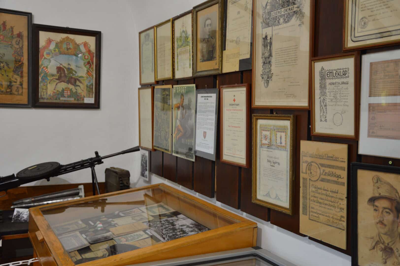 A tárlat legnagyobb része a második világháború időszakát őrzi: a tányérakna és tanklőszerek mellett géppisztolyok, puskák, lőszerek, gyermek és felnőtt gázálarcok, gépkarabélyok, kézigránátok, sőt még tank lánctalpszemek is találhatóak. Helyet kapnak itt a Horty-korszak Levente Mozgalmát bemutató dokumentumok, de olyan bizonyítványt és emléklapot is találunk, amit Horthy István és felesége, Horthy Istvánné láttak el kézjegyükkel.