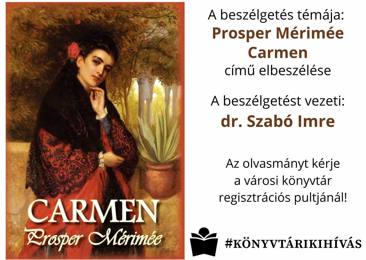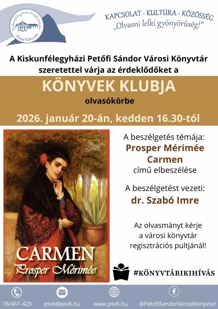 Az év első Könyvek Klubja január 20-án, 16.30-tól várja az olvasni és beszélgetni vágyókat a Kiskunfélegyházi Petőfi Sándor Városi Könyvtárban. A középpontban Prosper Mérimée: Carmen című elbeszélése áll, ami a szenvedély, a szabadságvágy és a tragikus szerelem izzó történetét idézi meg a spanyolországi cigány közegben.