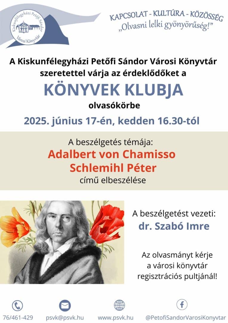 A Könyvek Klubja olvasókörének soron következő alkalmán egy gondolatébresztő, filozófiai kérdéseket is felvető történet áll majd a figyelem középpontjában: Adalbert von Chamisso Schlemihl Péter című elbeszélése. A beszélgetést június 17-én, kedden fél öttől tartják a Kiskunfélegyházi Petőfi Sándor Városi Könyvtárban.