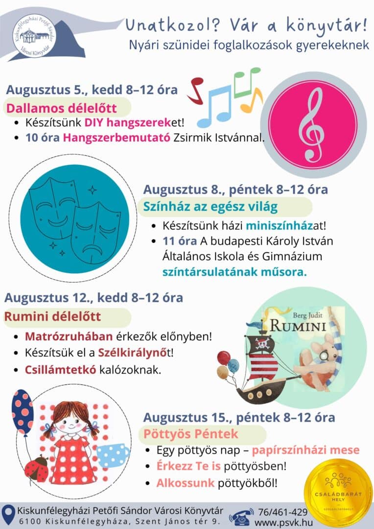 Dallamos délelőttön vehetnek részt a gyerekek, augusztus 5-én, kedden. A délelőtt során saját készítésű gitárt és „szájharmonikát” alkothatnak, majd 10 órától Zsirmik István izgalmas hangszerbemutatója következik. Augusztus 8-án, pénteken a színházé lesz a főszerep, ekkor árnyjátékkal működő otthoni miniszínházat készíthetnek bábokkal, délelőtt 11 órakor pedig a budapesti Károly István Általános Iskola és Gimnázium színtársulatának előadását tekinthetik meg a résztvevők.