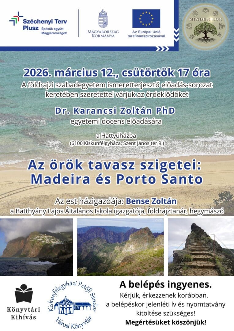 Madeira és a hozzá tartozó Porto Santo szigetei nem véletlenül viselik az „örök tavasz szigetei” elnevezést. Az egész évben enyhe, kiegyensúlyozott éghajlat, a változatos vulkáni tájak, a meredek hegygerincek, a látványos sziklapartok és a gazdag növényvilág mind hozzájárulnak ahhoz, hogy a szigetek Európa egyik legkülönlegesebb természeti térségének számítsanak. Az előadás során a hallgatóság nemcsak a szigetek földtani kialakulásáról és tájformáiról hallhat érdekességeket, hanem betekintést kap a helyi élővilágba, a tájhasználatba és a turizmus földrajzi vonatkozásaiba is.