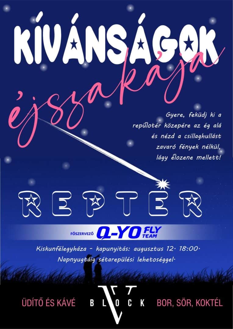 A nap utolsó sugarai mellett sétarepülésre is lehetőség nyílik, míg az éjszaka beálltával pokrócra heveredve, a városi fényektől távol gyönyörködhetünk a hullócsillagok látványában, élőzenei aláfestéssel. A természetközeli élményt a V-Block Kávézó által kínált frissítő italok – limonádé, kávé, bor, koktél és sör – teszik teljesebbé.