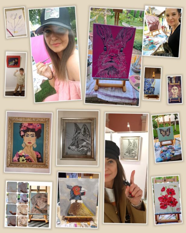 Festészete szorosan összefonódik ezzel az élményvilággal. Autodidakta módon képezi magát, online kurzusokon, előadásokon keresztül mélyíti tudását. Képei érzelmeket hordoznak. Rókák, madarak, virágok, tájak bukkannak fel vásznain, mindegyikükben ott él az az erő, amit belülről hoz. Portrékat, önarcképeket, kedvenceket és tájakat is örömmel fest, mindig úgy, hogy a néző is megtalálja benne saját történetét.