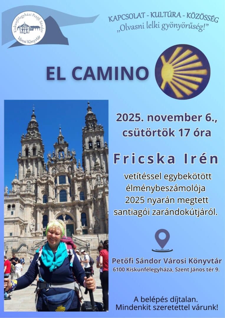 Aki valaha is álmodott arról, hogy végigjárja az El Caminót, most testközelből hallhatja, milyen érzés napokon át gyalogolni a tengerparti ösvényeken, miközben az ember nemcsak a tájat, hanem önmagát is felfedezi. Fricska Irén november 6-án, csütörtökön 17 órától tart vetítéssel egybekötött úti beszámolót a Kiskunfélegyházi Petőfi Sándor Városi Könyvtárban, ahol a portugál zarándokút élményeit osztja meg az érdeklődőkkel.
