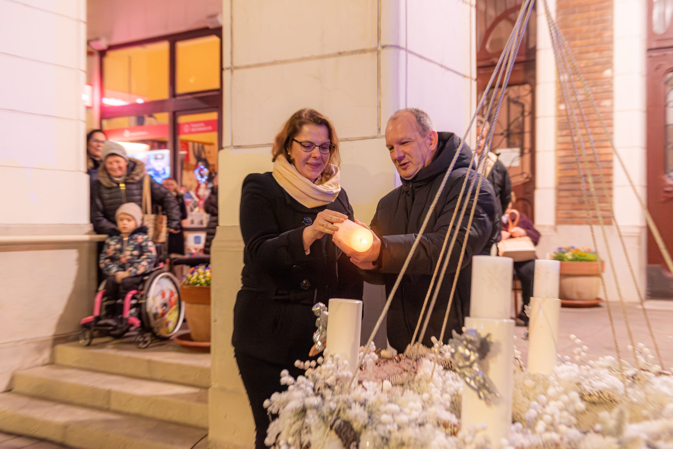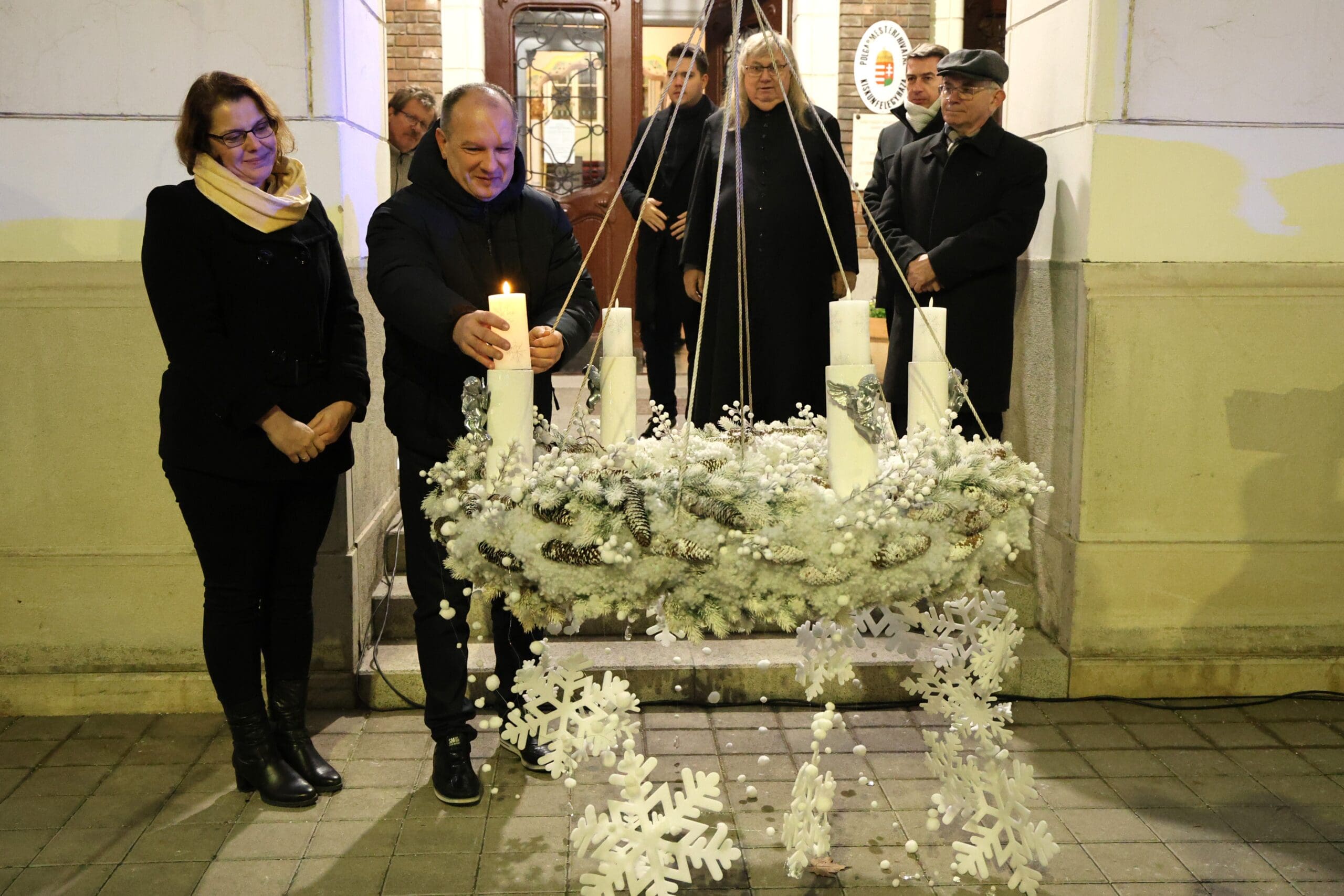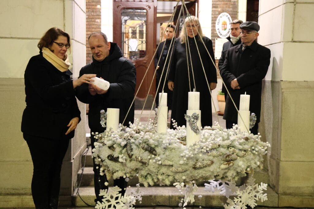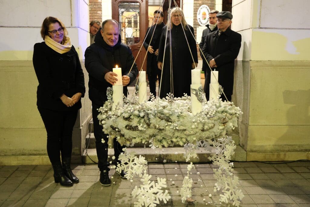 A műsor után az első gyertyát a városi adventi koszorún dr. Tigyi-Aradi Alexandra jegyző és Csányi József polgármester gyújtotta meg. Az önkormányzat jóvoltából forralt bor, meleg tea és sütemény várta a megjelenteket.