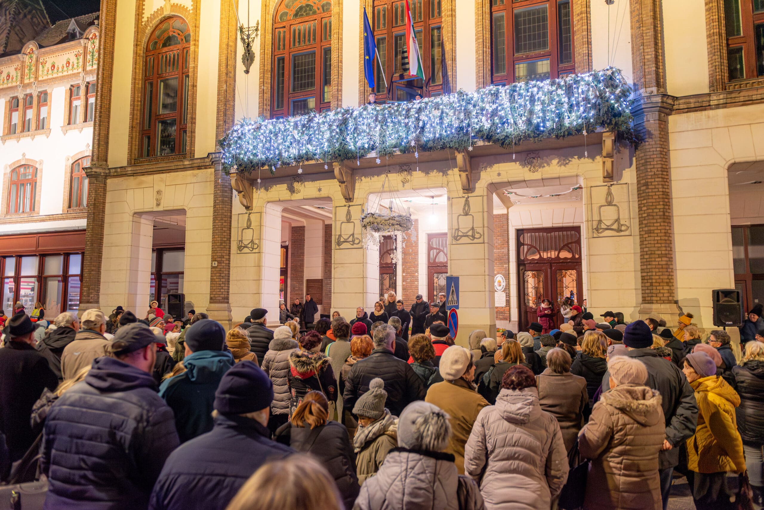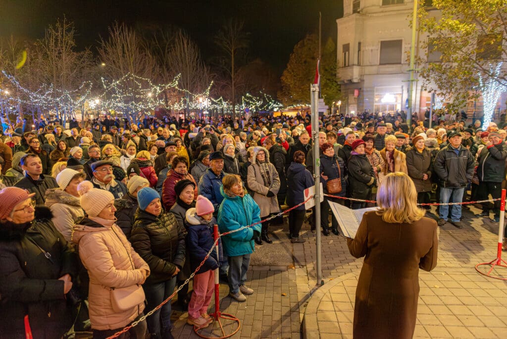 Csányi József polgármester köszöntőjében emlékeztetett mindenkit, hogy az év azon részéhez érkeztünk, amikor valami fontosra készülünk. Az egész éves teendőinket, a velünk történ dolgokat ilyenkor összegezzük és apránként a szívünket és lelkünket ünneplőbe öltöztetjük. Mindezek mellett fontos törekednünk arra, hogy minél több időt tudjunk szeretteinkkel tölteni. Az egész éves rohanás közepette az advent és a karácsony időszaka alkalmas leginkább arra, hogy kicsit hosszabb időre együtt legyünk családunkkal és közösen örüljünk az együtt töltött órák lehetőségének. Ünnepeljük meg azt is, hogy itt Kiskunfélegyházán békességben, a világ zajától védve tudjuk élni életünket! Megköszönte Keresztes Tünde és az önkormányzat dolgozóinak munkáját, akik keze nyomán idén még több fény és dekorációs elem került ki a városba, a gyerekek örömére.