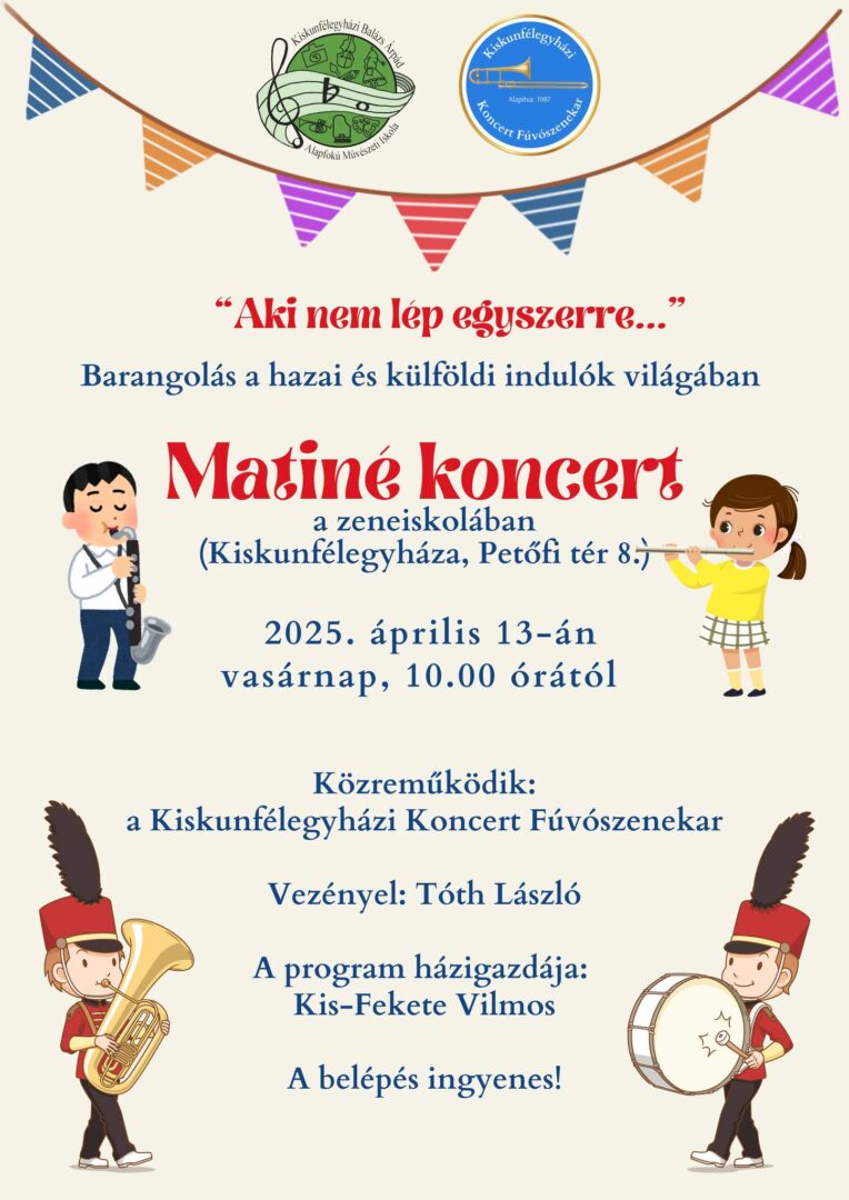 Az „Aki nem lép egyszerre...” című műsor garantáltan szórakoztató zenei kalandra hívja a kicsiket és nagyokat egyaránt. A koncert célja, hogy minden korosztály – a legkisebbektől a felnőttekig – jól szórakozzon, és egy kicsit közelebb kerüljön a fúvószene varázslatos világához. A zenekart Tóth László vezényli, a házigazda Kis-Fekete Vilmos lesz. A belépés ingyenes, a jókedv garantált!