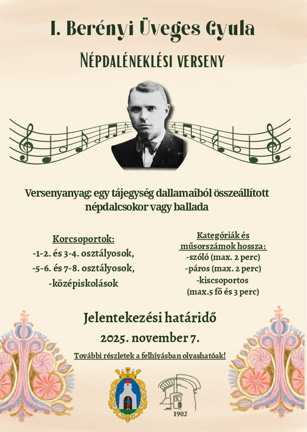 A Kiskun Múzeum idén rendezi meg az I. Berényi Üveges Gyula Népdaléneklési Versenyt, amelyre általános és középiskolás diákok jelentkezését várják. A cél: hogy a fiatalok felfedezzék és továbbvigyék a népdal varázsát – azt az élő kapcsolatot, amely múltunkat, közösségünket és hagyományainkat összeköti. Nevezési határidő november 7-e.