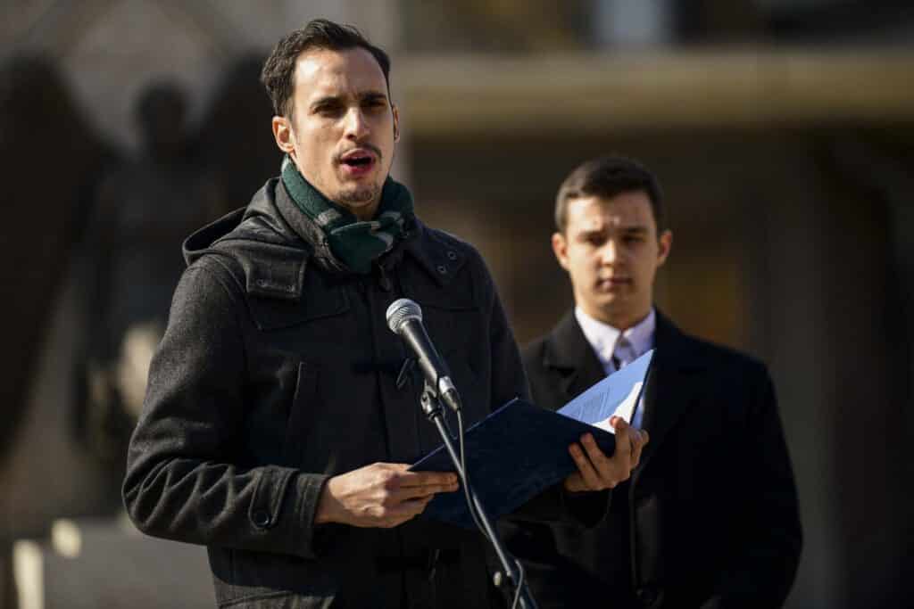 – Nem véletlen, hogy ezen a napon éppen itt állunk, a vasútállomás előtti téren. Az itt látható emlékmű angyala három bajtársunk emlékét őrzi. Ők: dr. Návay Lajos, Csanád vármegye alispánja, a Magyar Országgyűlés képviselőházának elnöke, unokaöccse, Návay Iván, továbbá dr. Kiss Béla, Szentes város főjegyzője. Mindhárman itt haltak meg, kegyetlen körülmények között.