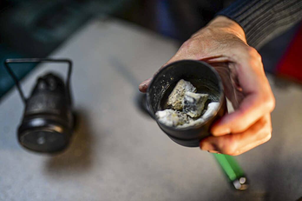 – A karbidlámpa üzemanyaga nem petróleum, hanem egy mesterséges anyag, a karbid. Hogyha ezt víz éri, sisteregni kezd, és acetilén gáz képződik. A lámpa aljába beletesszük a karbidot, fölül pedig van egy víztartály. Ennek a csapját megnyitjuk, így a víz csöpögni kezd, a fejlődő gáz pedig egy égőn keresztül kijön, és erős vakító fehér fényt ad. Világítás közben a víz elpárolog, melléktermékként pedig mész rakódik le a lámpafejbe és a tartályba – ismerteti működésüket.