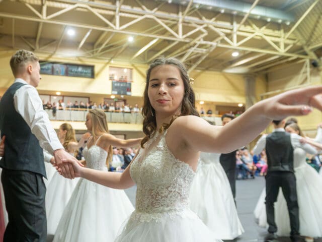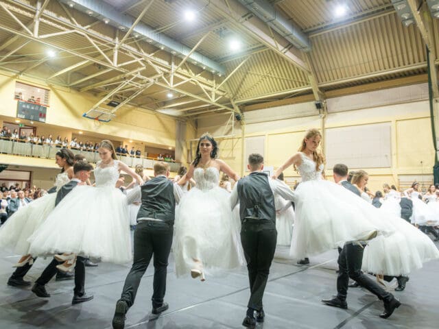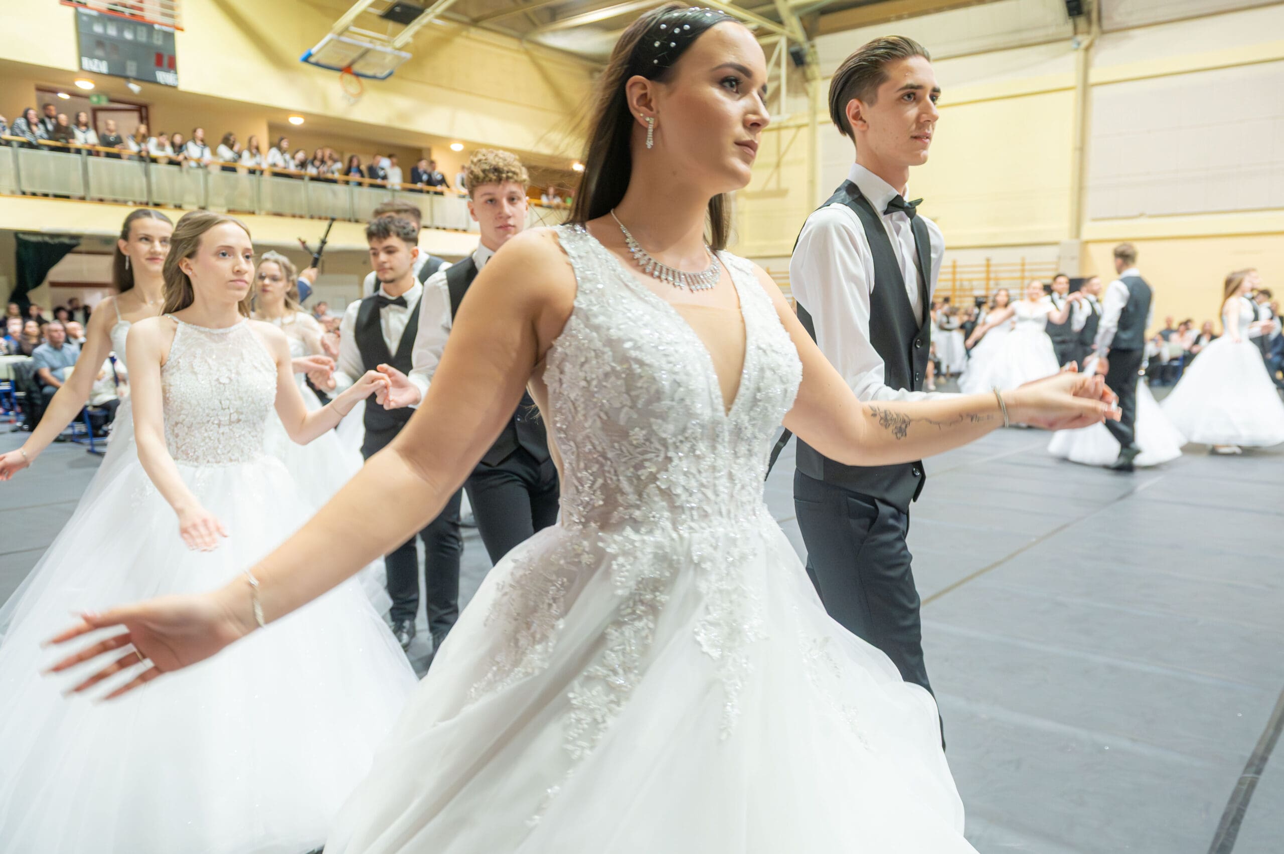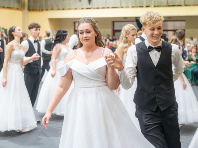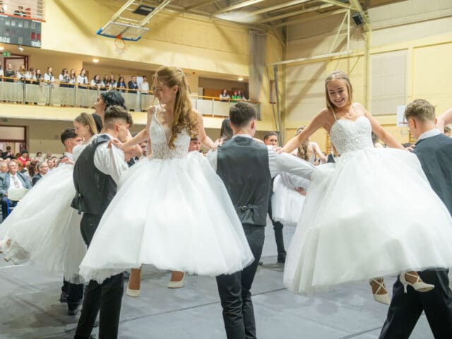 Ezt követően került sor a szalagtűzésre. Az osztályok egyenként kapták meg osztályfőnökeiktől a felnőtté válás egyik fontos jelképeként szolgáló szalagot, majd rövid szünet következett, hogy felkészüljenek az est fénypontjára, a keringőre.