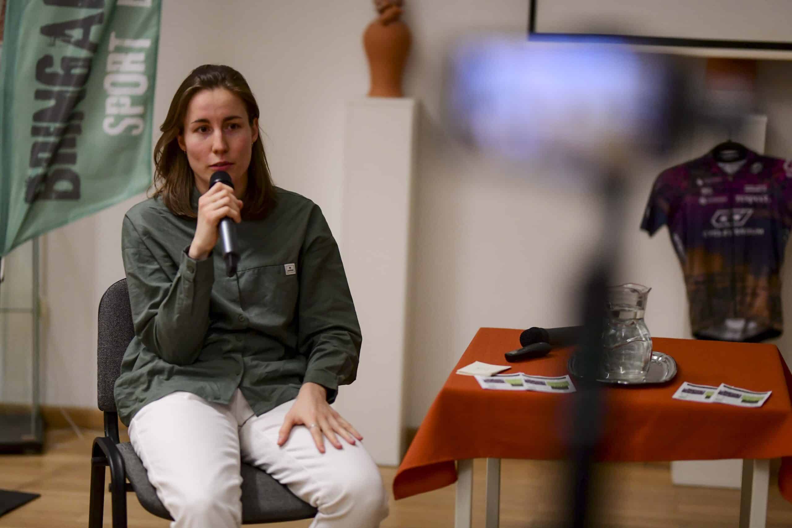 Előadásában felidézte sportolói karrierjének kezdetét: évekig női labdarúgóként versenyzett, ám a sportág iránti lelkesedése idővel alábbhagyott. A COVID-járvány alatt kezdett el kerékpárral közlekedni, hogy csökkentse a fertőzésveszélyt, majd egyetemi tanulmányai során a triatlonnal is megpróbálkozott. Az úszás és a futás azonban nem nyerte el a tetszését, így végül kizárólag a kerékpározás mellett döntött.