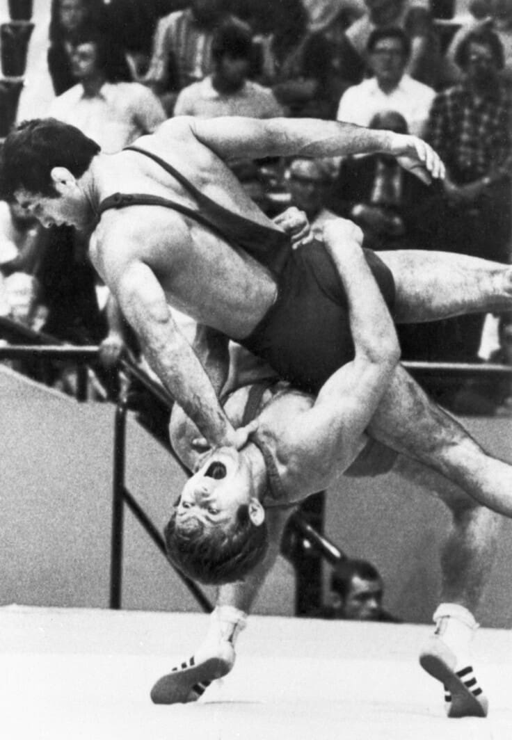 A szovjet MEGRELISVILI és RÉCZI László (alul) birkózók küzdelme a kötöttfogású birkózás 62 kg-os kategóriájában a XX. nyári olimpián. A magyar sportoló kikapott ellenfelétõl.