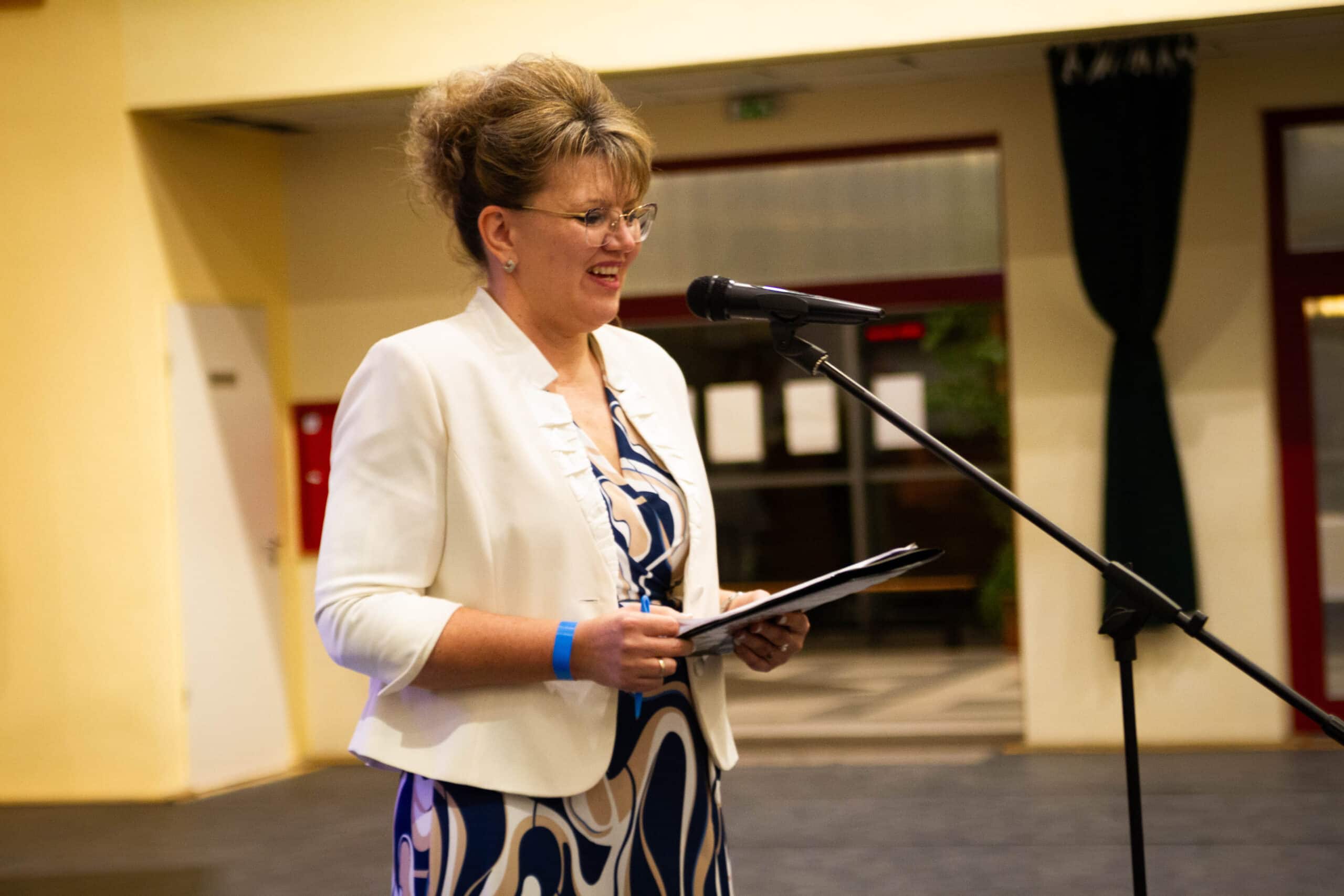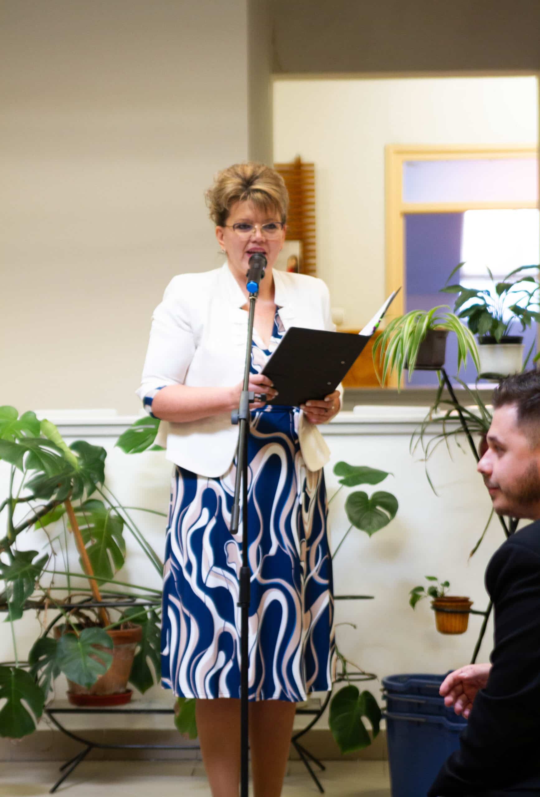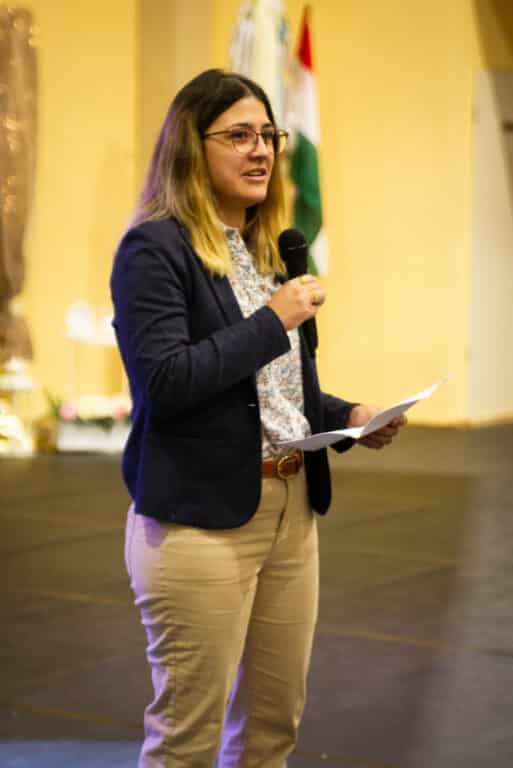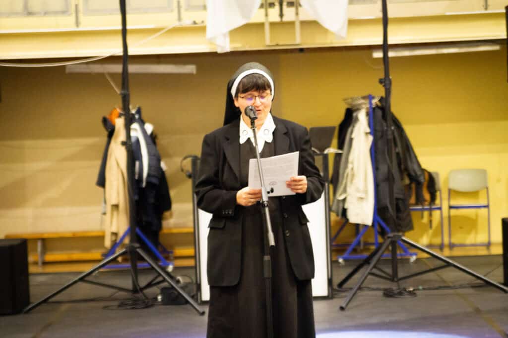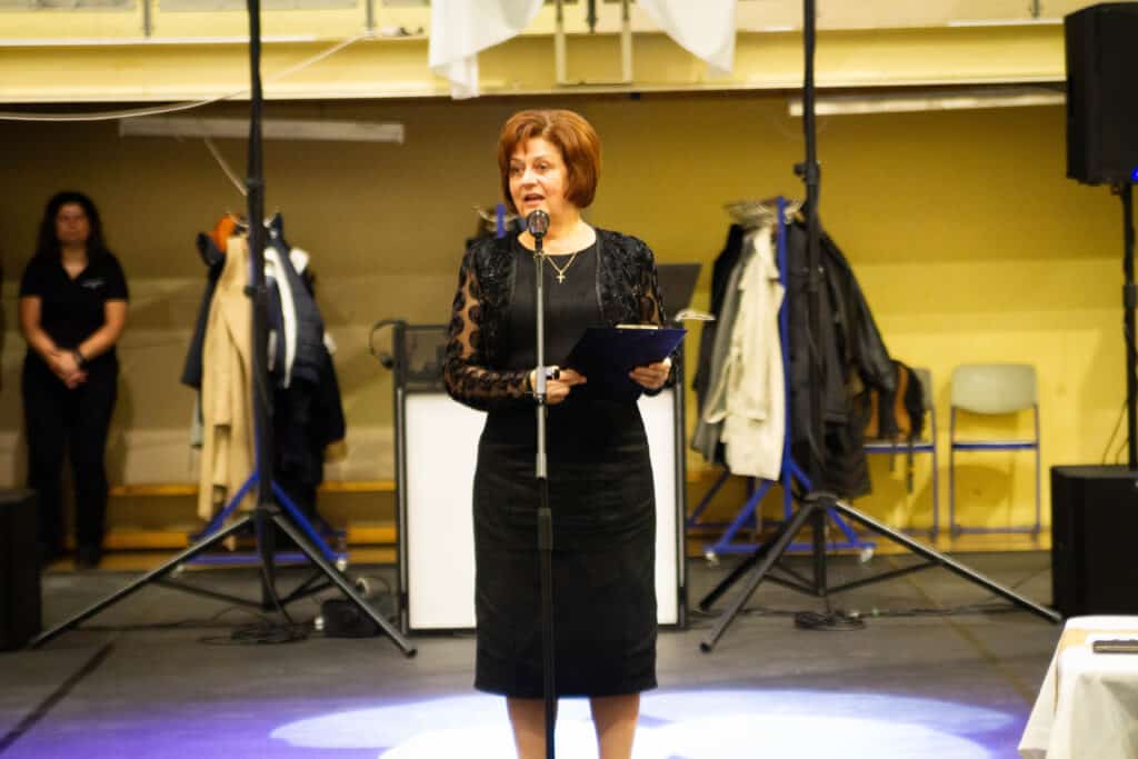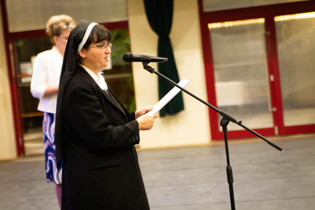 Az esti ünnepi program a sportcsarnokban folytatódott, ahol a fenntartó rend általános főnöknője, Dávid M. Bernadette nővér üzenetét is tolmácsolták. Szavai az újraindulás időszakát és a Kalocsai Iskolanővérek elhivatottságát idézték fel, akik a legnehezebb években is hűek maradtak a keresztény nevelés értékeihez. A rendezvényen Mayer Tamásné, az intézmény korábbi igazgatója és Mindák József főigazgató is megszólalt: előbbi a kezdeti évek kihívásaira emlékezett, utóbbi pedig az elmúlt időszak fejlesztéseit és sikereit emelte ki.