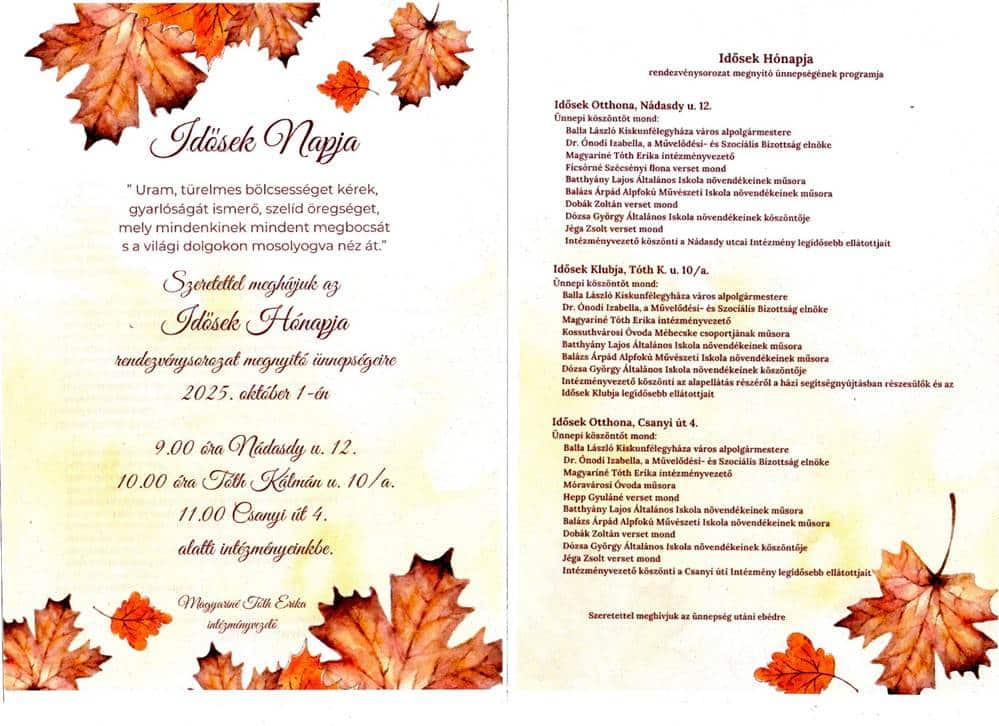 A programsorozat az Idősek Világnapjával, október 1-jén kezdődik: 9 órakor a Nádasdy utcai Idősek Otthonában, 10 órakor a Tóth Kálmán utcai klubban, majd 11 órakor a Csanyi úti otthonban tartanak ünnepi megnyitót. Mindhárom helyszínen köszöntőt mond Balla László alpolgármester, dr. Ónodi Izabella, a művelődési és szociális bizottság elnöke, valamint Magyariné Tóth Erika intézményvezető. Az ünnepi hangulatot a helyi óvodák és iskolák színesítik: fellép a Batthyány Lajos Általános Iskola, a Balázs Árpád Alapfokú Művészeti Iskola, a Dózsa György Általános Iskola, valamint a Kossuthvárosi és a Móravárosi Óvoda növendékei. A szavalatokat Ficsórné Szécsényi Ilona, Dobák Zoltán, Hepp Gyuláné és Jéga Zsolt adja elő, az intézményvezetők pedig mindhárom helyszínen külön köszöntik a legidősebb ellátottakat. A nyitónap délutánján 14 órakor szentmise lesz a Nádasdy utcai otthonban.