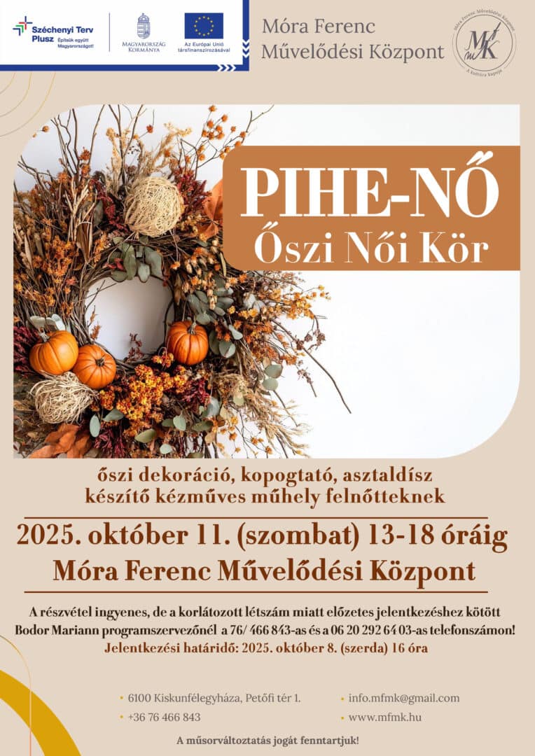 Alkotó délutánra várják a hölgyeket október 11-én, szombaton 13 és 18 óra között a Móra Ferenc Művelődési Központban. A Pihe-Nő – Őszi női kör keretében a résztvevők saját kezűleg készíthetnek őszi dekorációkat, kopogtatókat és asztaldíszeket, miközben kellemes hangulatban, egymást inspirálva tölthetnek el néhány órát.