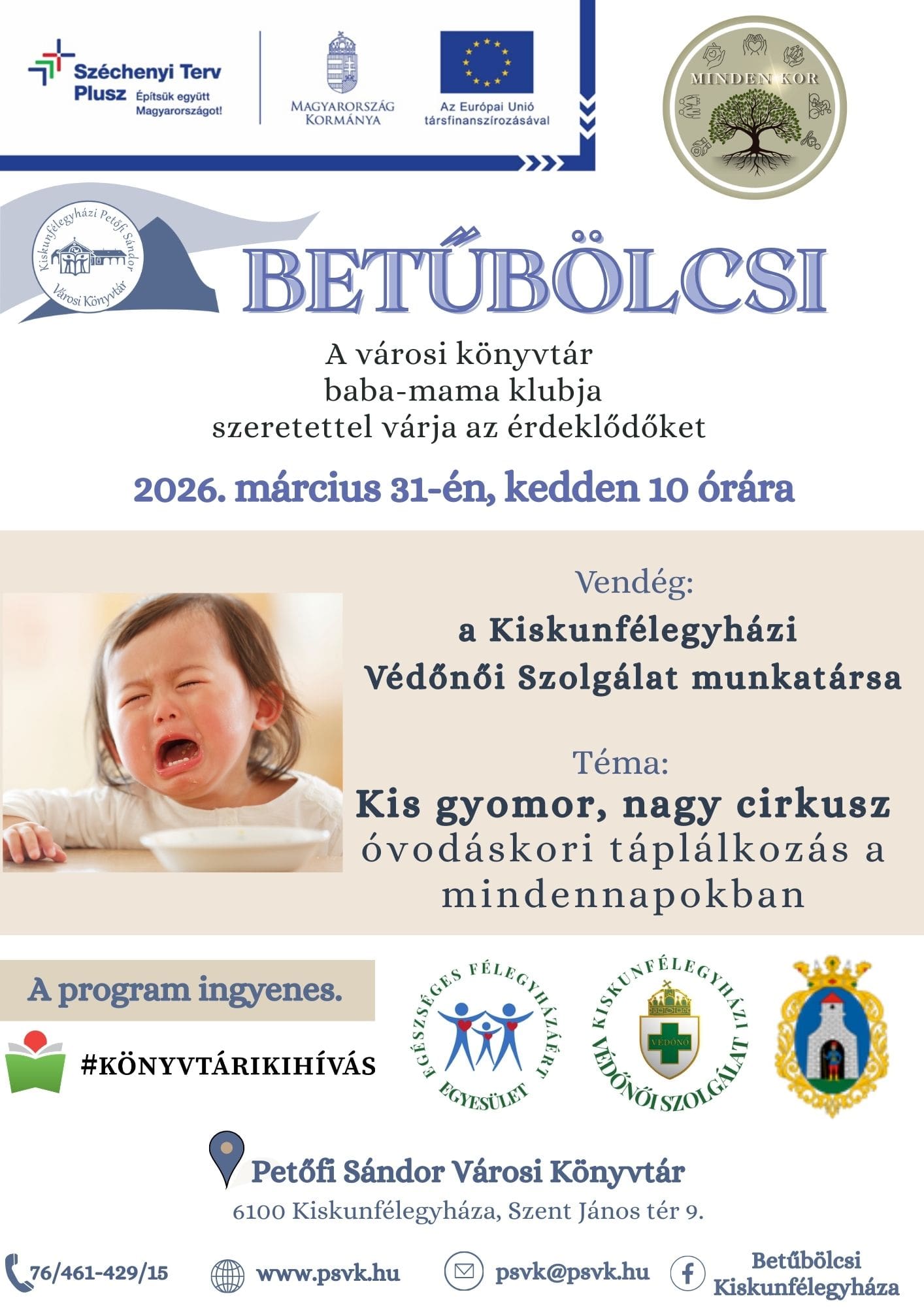Az esemény témája az óvodáskori táplálkozás lesz, ahol a Kiskunfélegyházi Védőnői Szolgálat munkatársa ad praktikus tanácsokat a szülőknek.
