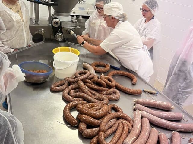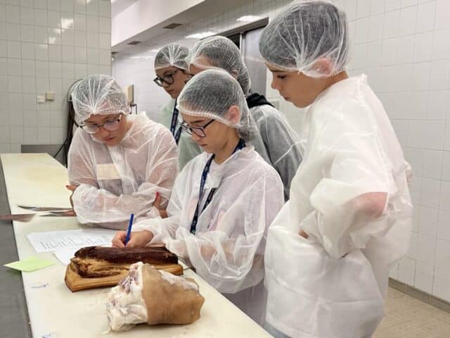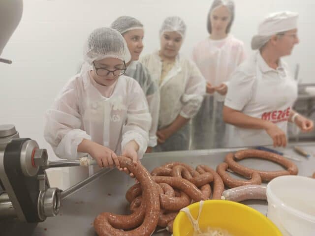 A keddi napon a hentes szakma középpontba állítását tűztük ki célul. A reggeli elfogyasztása után az iskola húsipari tanüzemébe látogattak el a tanulók tanári vezetéssel. Már a köpeny, hajháló, cipővédő felvétele is nagyon tetszett a fiataloknak. Ezután az oktató bemutatta a húsipari tanüzemet, és beavatta őket a kolbásztöltés fortélyaiba, amit ki is próbáltak a lelkes jelentkezők. Nemcsak a gyártás folyamatát próbálhatták ki a tanulók, de megízlelhették a házias jellegű, hagyományos ízvilágot felidéző, tanüzemben gyártott húsipari termékeket –disznósajtot, angol szalonnát, májast és frissen sütött tepertőt. A program ebéd után laboratóriumi vizsgálatokkal (ph mérés, tejsűrűség mérés és savfok meghatározás titrálással) és húsipari termékek érzékszervi bírálatával folytatódott. Nagyon lelkesek voltak a fiatalok, elbűvölte őket a laboratórium világa. Élményekkel tele záródott a második nap is.