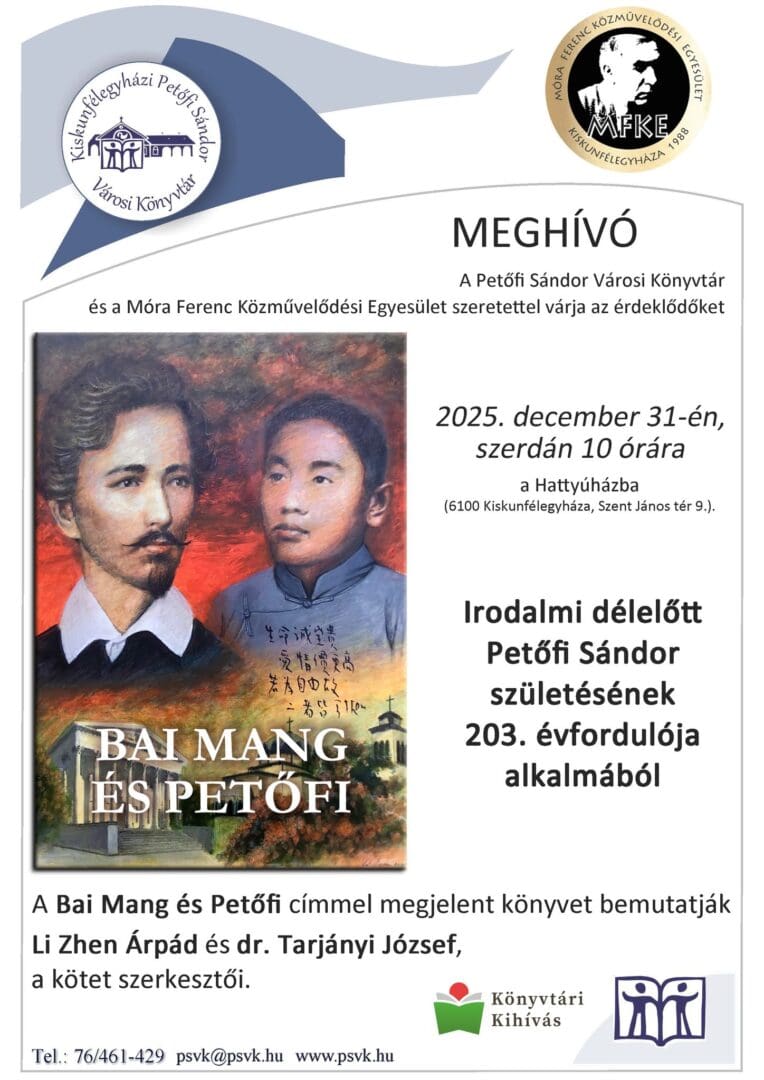 A Petőfi Sándor Városi Könyvtár és a Móra Ferenc Közművelődési Egyesület szeretettel várja az érdeklődőket Petőfi Sándor születésének 203. évfordulója alkalmából szervezett irodalmi megemlékezésre december 31-én, szerdán, 10 órakor, a Hattyúházba.