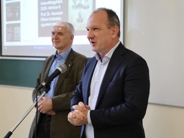 A beszédek után dr. Hermann Róbert történész professzor vette át a szót, első előadásának témája a Petőfi család volt. Költőnkről a bevezetőjében kiemelte, hogy az első olyan alkotó volt a magyar irodalomban, akinek témáiban a család kiemelt szerepet kapott. A Petrovics szülők felmenői mindkét ágon felvidéki szlovák eredetűek, a vándorlás során magyarosodtak el. A névváltás is a szülők időszakában ment végbe, ez a korabeli Magyarországon általános folyamatnak számított. Petőfi apja, Petrovics István korának tipikus vállalkozója volt, a leírások szerint lobbanékony, indulatos természetű ember, aki mindenkor fellépett jogai védelmében. Az apa 1824. október 14-én vette bérbe először Kiskunfélegyháza két mészárszékét, később Szabadszálláson is nyitott bérleményt. Pályája felfelé ívelt, 1828-tól redemptus lett. Sándor színészi pályáját nem támogatta, érvényét olykor testi fenyítéssel nyomatékosította. A jómódot a dunai árvíz törte ketté: a katasztrófa során házuk és két istállójuk megsemmisült, később alvállalkozói nem fizettek, becsapták, ezért több ezer forintnyi adóssága keletkezik. Lassan állt fel a család a nehézségekből, 1841 májusára sikerült a hitelezőket kifizetni. Sándornak fontos volt, hogy segítse szüleit, évekkel később például a János Vitéz honoráriumából 100 forintot adományozott számukra. A professzor előadása során részletesen kitért a szülők mellett Szendrey Júlia személyére, Petőfi életében betöltött pótolhatatlan szerepére, majd a költő halála utáni eseményekre is.