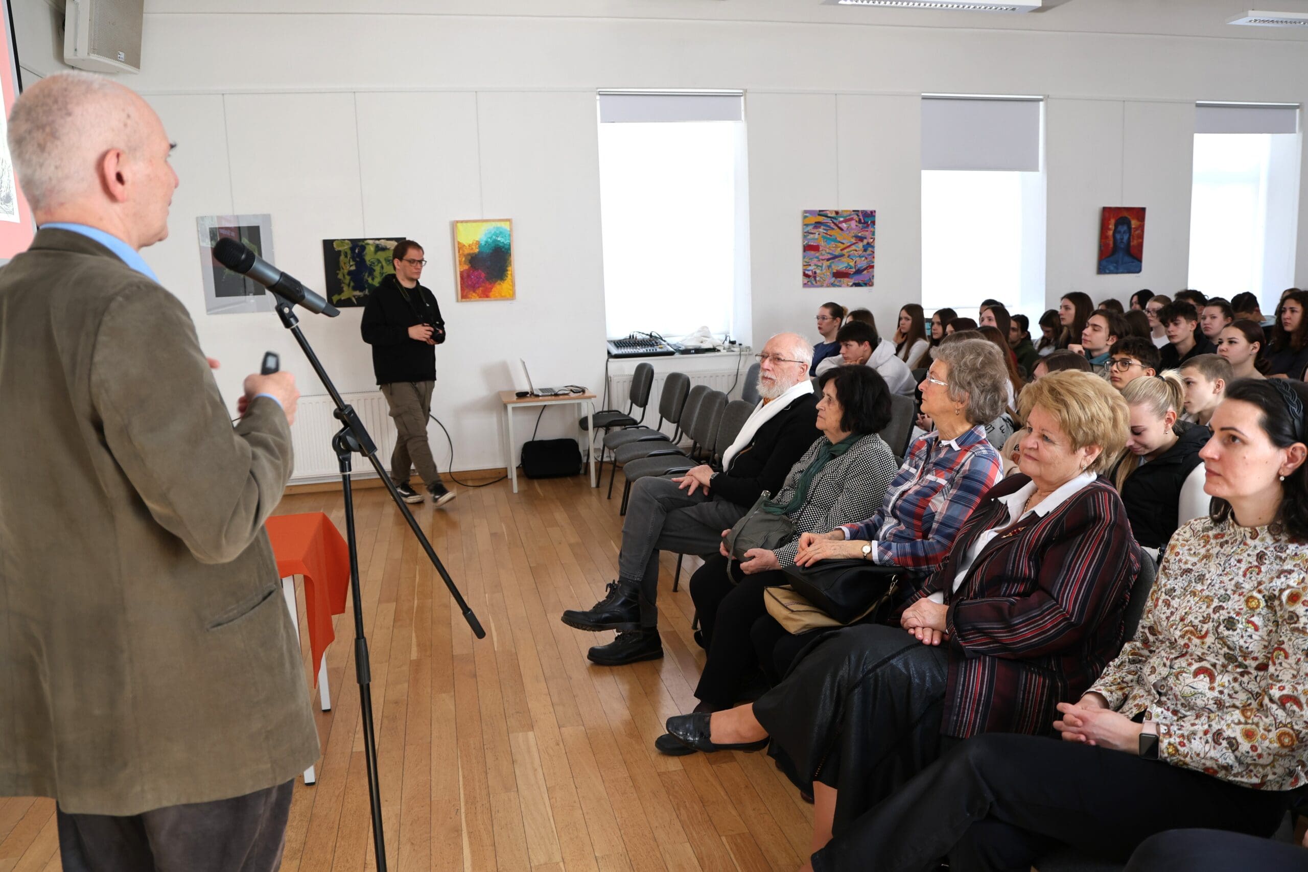 Délelőtt a Szent Benedek PG intézménybe látogatott el, ahol több száz diák ismerhette meg a Petrovics/Petőfi család több generációjának történetét és a márciusi hadjárat részleteit. A megjelenteket Tóth Gyuláné, az intézmény nyugalmazott igazgatója, az alapítvány kuratóriumi elnöke köszöntötte. Beszédében bemutatta az előadót, aki már harminc éve tart jeles alkalmakkor a PG fiataljainak rendhagyó irodalomórákat.