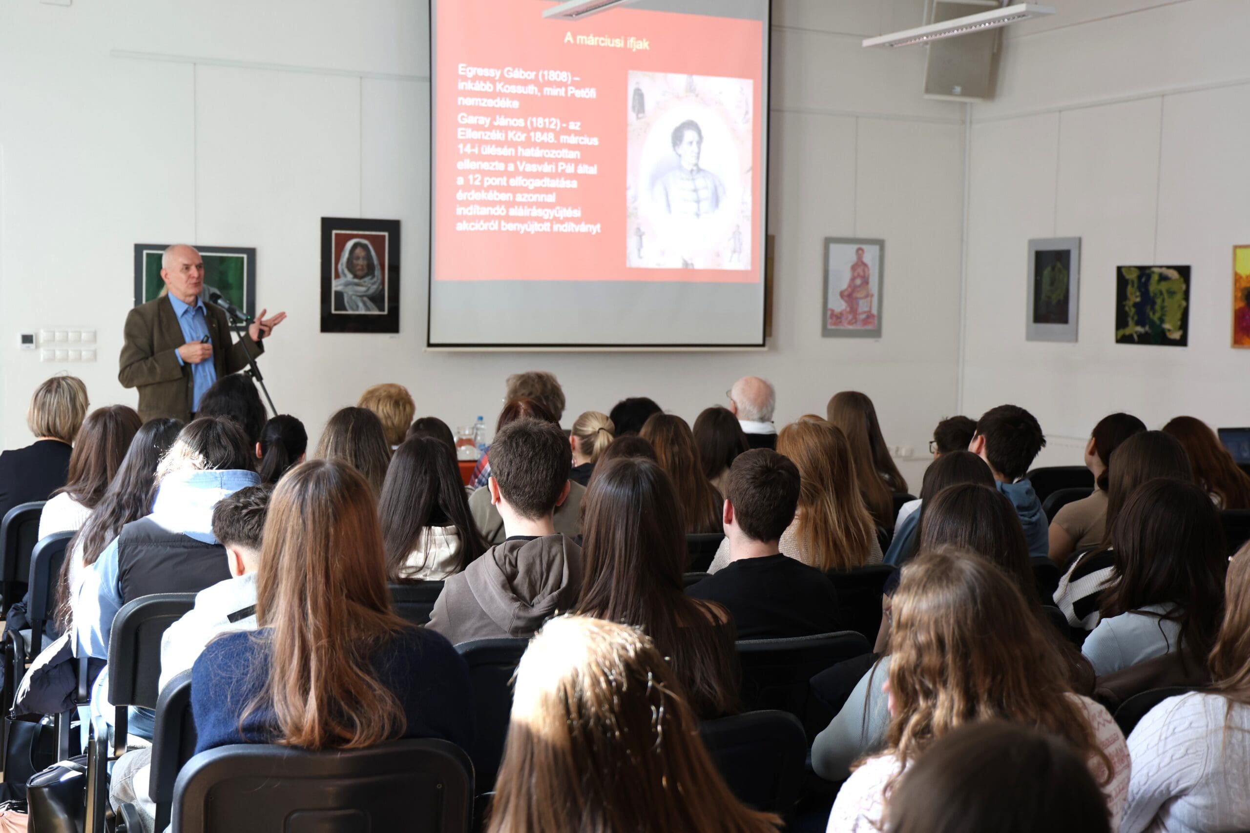 Dr. Hermann Róbert hétfőn délután a Petőfi Sándor Városi Könyvtárban folytatta tudományos előadásai sorát, itt a Constantinum Technikum, a Kossuth Lajos Szakképző Iskola és a Móra Ferenc Gimnázium fiataljai tudhattak meg részleteket a márciusi ifjakról. Azokról a fiatalokról, akik 1848-ban a 18-28 éves korosztályt képviselték és tevőlegesen vettek részt a március 15-ei eseményekben. Személyüket, foglalkozásukat, vallási hovatartozásukat is részletesen ismertette a professzor, majd kitért a korabeli nyomtatott sajtót képviselő lapok bemutatására is, közöttük a Marczius tizenötödike címűre is. A megjelentek megismerhették a három legkomolyabb politikai szerepet játszó fiatal, Irányi Dániel, Irinyi József és Jókai Mór jelentőségét, majd későbbi szerepvállalásaikat. A diákok átfogó képet kaphattak a kor, valamint a forradalom és szabadságharcban résztvevő értelmiségi szereplők céljairól, eszméiről, amely által ismereteik, tájékozottságuk sokkal mélyebbé válhatott a témában.Az előadás végén Tóth Gyuláné köszönte meg a professzor egész napos munkáját, a három rendhagyó irodalom és történelemórát, valamint a Petőfi Sándor Városi Könyvtár és az önkormányzat Ifjúsági Irodájának a megvalósításban nyújtott segítségét.