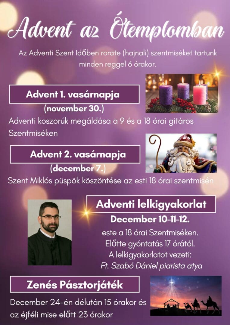 ADVENTI PROGRAMOK: Advent 2. vasárnapján az este 18 órai szentmisében Szent Miklós püspököt fogjuk köszönteni. Adventi lelkigyakorlatunk december 10-12. között lesz (szerda-csütörtök-péntek!) a 18 órai szentmisékben, a lelkigyakorlatot vezeti Ft. Szabó Dániel piarista atya. Részletek a plakáton olvashatók.