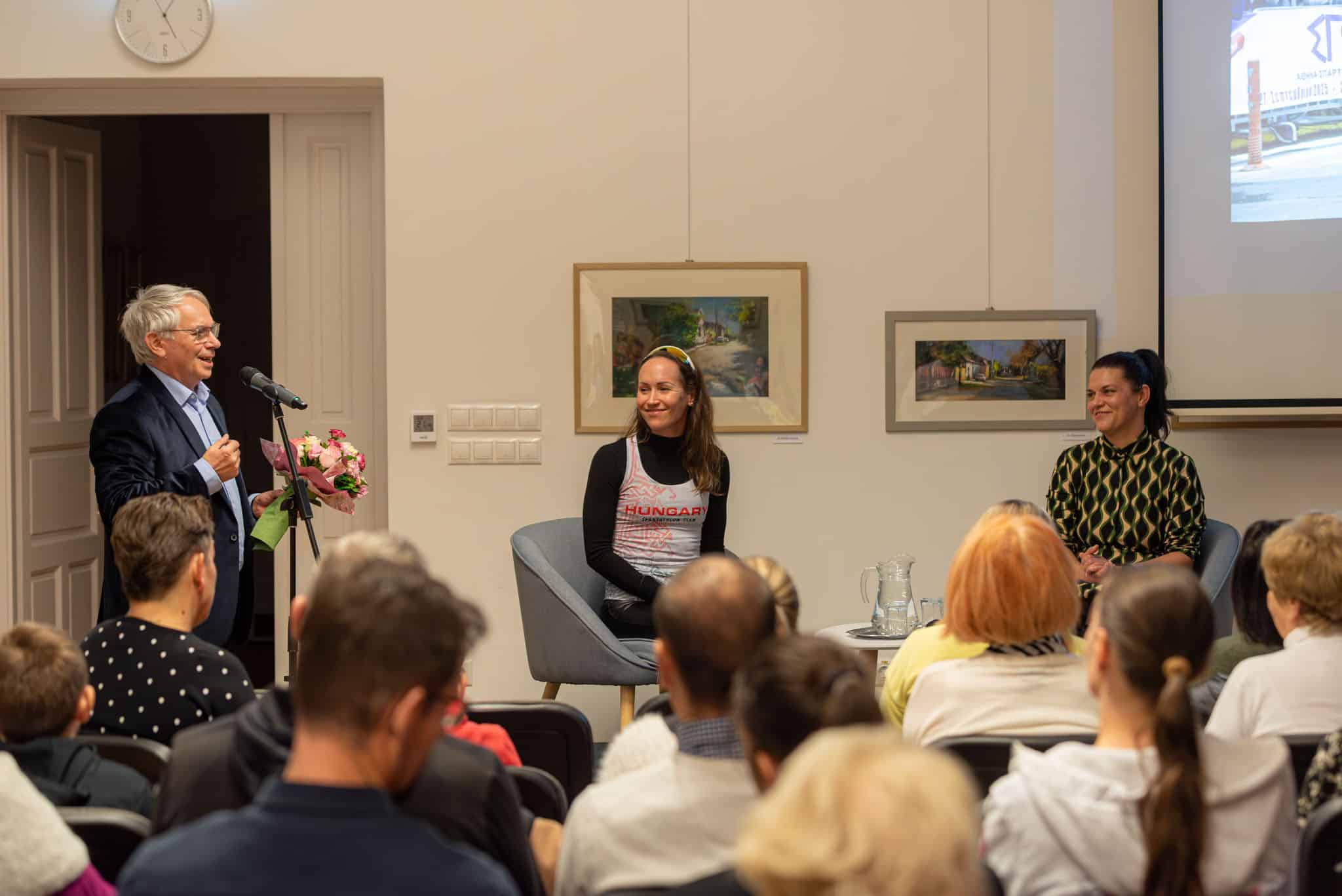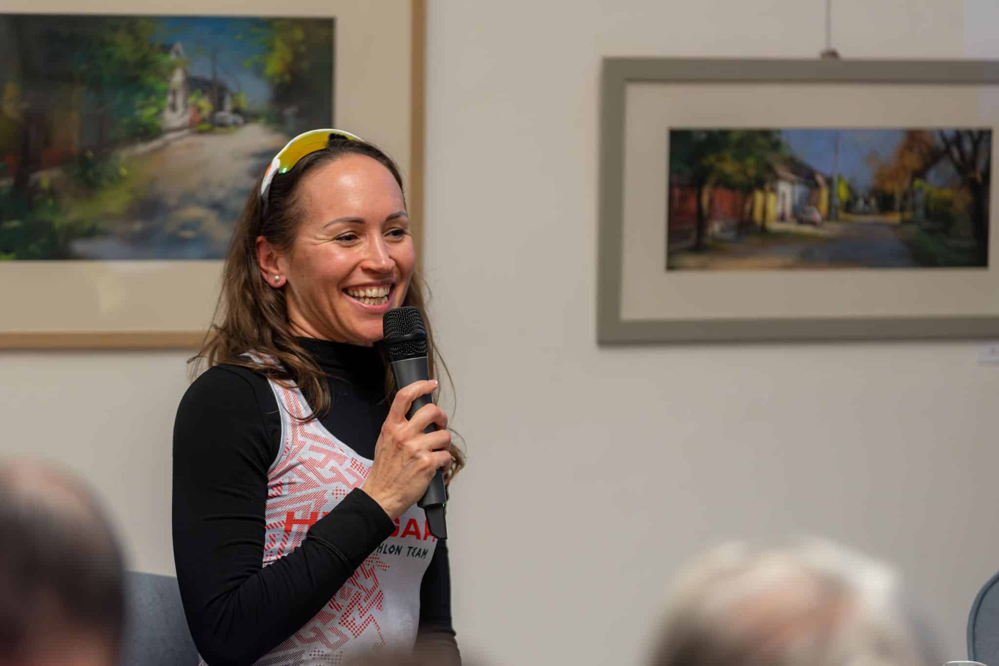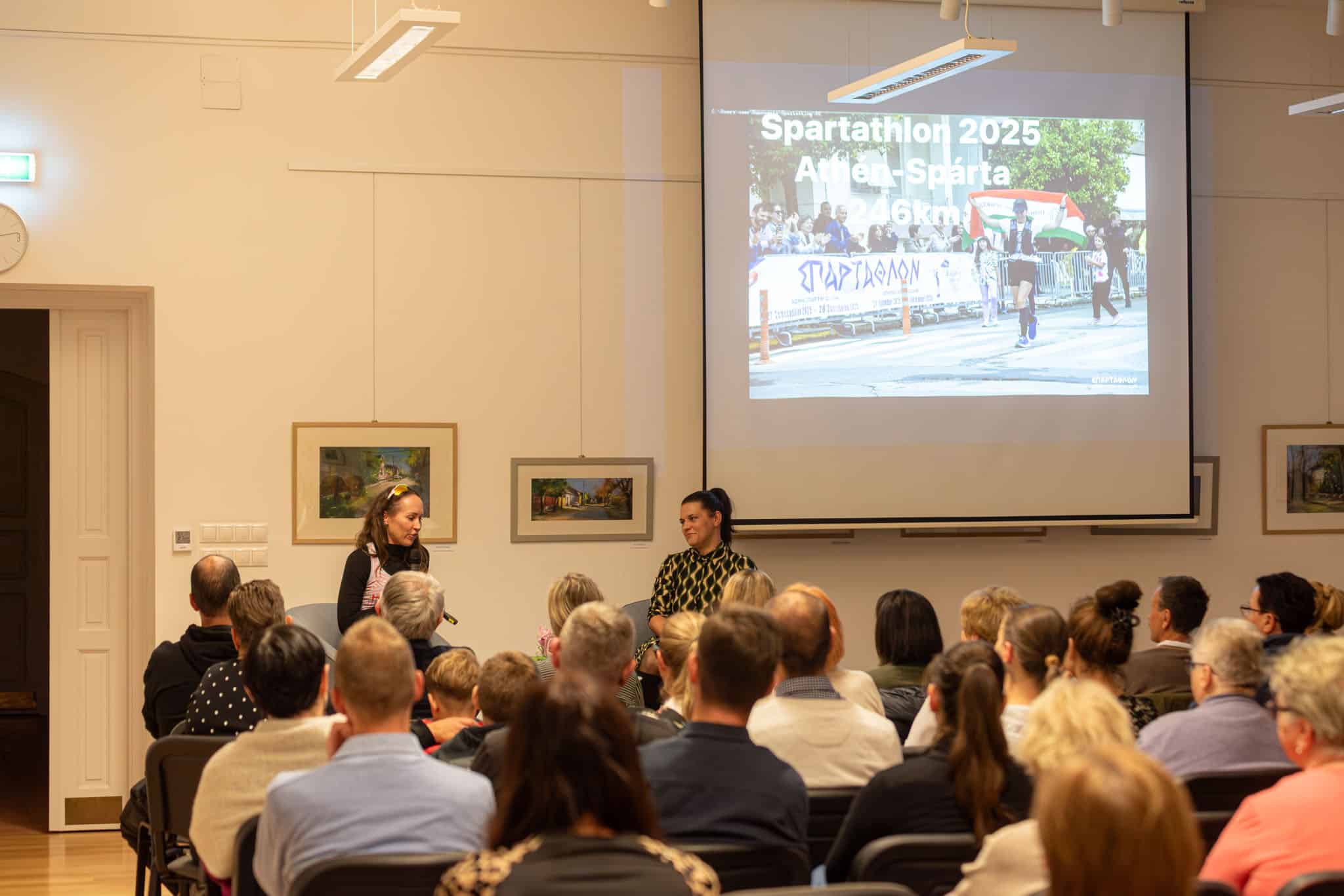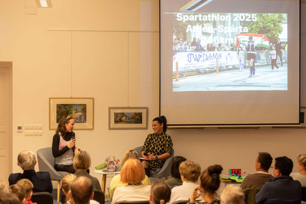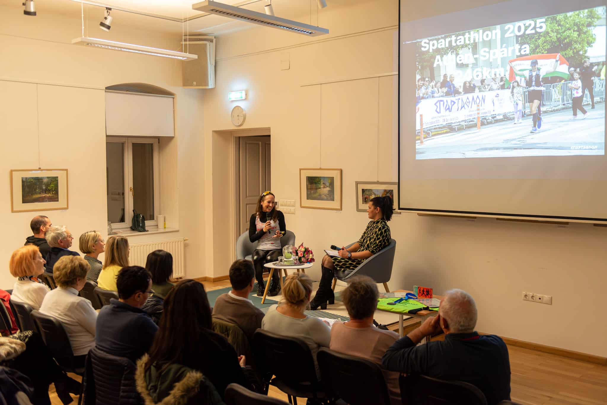 Az est során szó esett a felkészülés részleteiről, a 246 kilométer legnehezebb szakaszairól, a sportoló vívódásairól, fizikai fájdalmairól és a boldogságról, amikor ténylegesen megérinthette az ikonikus Leonidasz szobor lábát. A beszélgetés Kitti előadásmódjának köszönhetően sok nevetéssel, kedves történetekkel tarkított volt, az érdeklődők fotókat és videófilmeket is láthattak az embert próbáló verseny részleteiről.